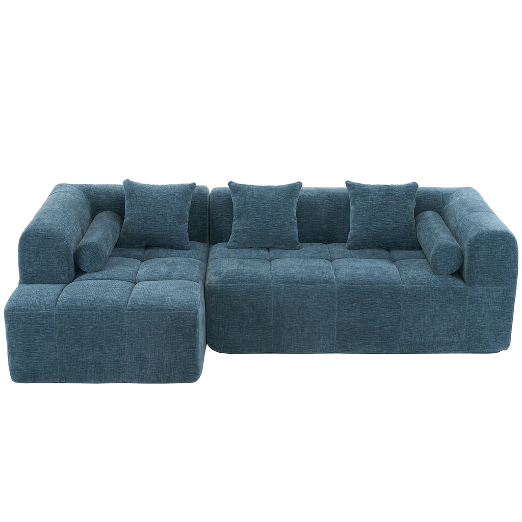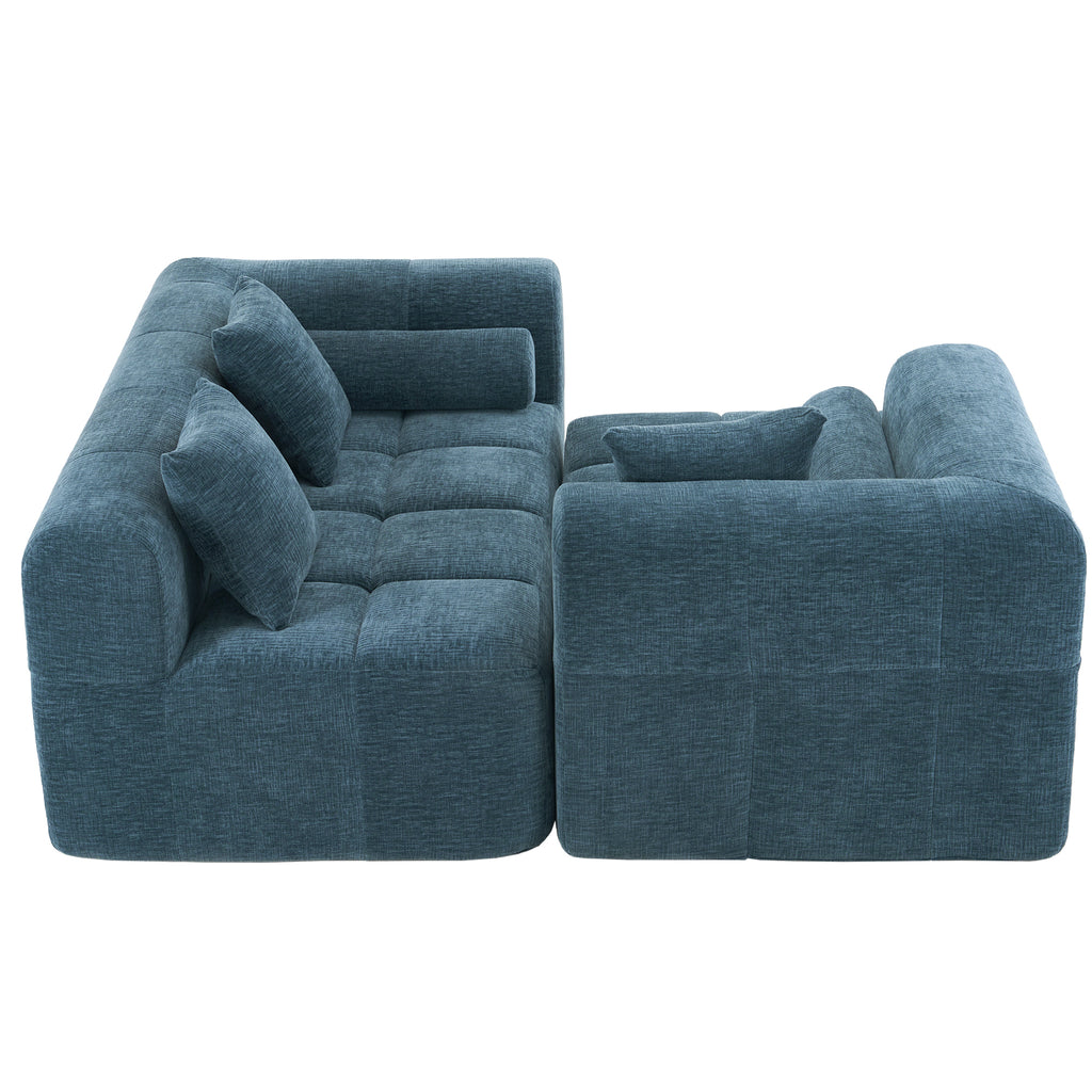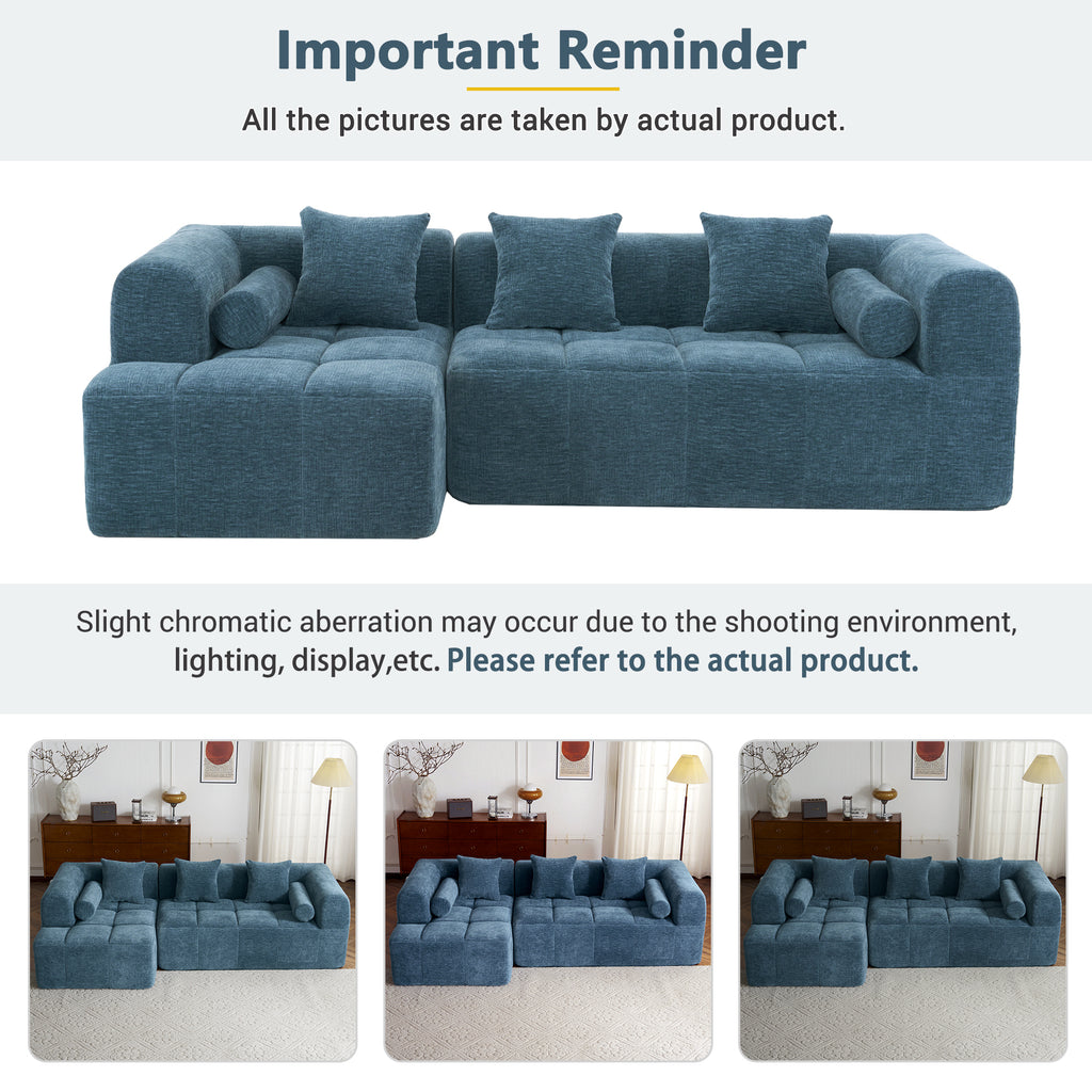 This modern modular sofa features a versatile two-piece design, allowing for flexible arrangements to fit various living spaces. Crafted entirely from high-density compressed foam, it offers exceptional comfort and durability while maintaining its shape over time. The elegantly curved armrests enhance both style and ergonomics, providing a cozy and inviting feel. For added support, the sofa includes three plush square pillows and two cylindrical bolster pillows, ensuring a comfortable lounging experience. Upholstered in a soft, neutral-toned fabric with sophisticated tufted detailing, this sofa seamlessly blends with different interior styles, making it a timeless and stylish centerpiece for any home.