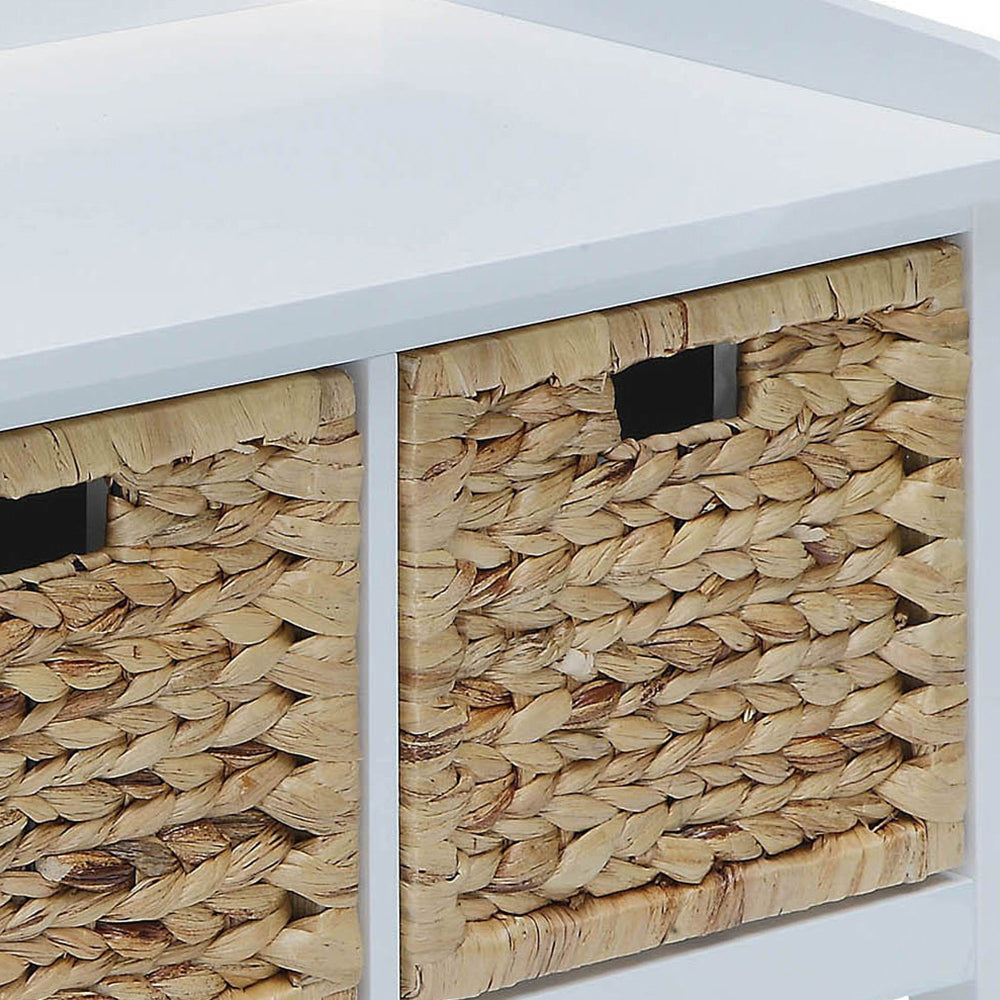 This versatile storage bench offers both functionality and style, featuring three spacious brown rattan baskets that serve as drawers for ample storage in your entryway or other spaces. With a low-profile design suitable for charming windowsill seating, it maintains a fresh and unobtrusive look, while the metal side glide mechanism ensures smooth and easy access to your stored items.
