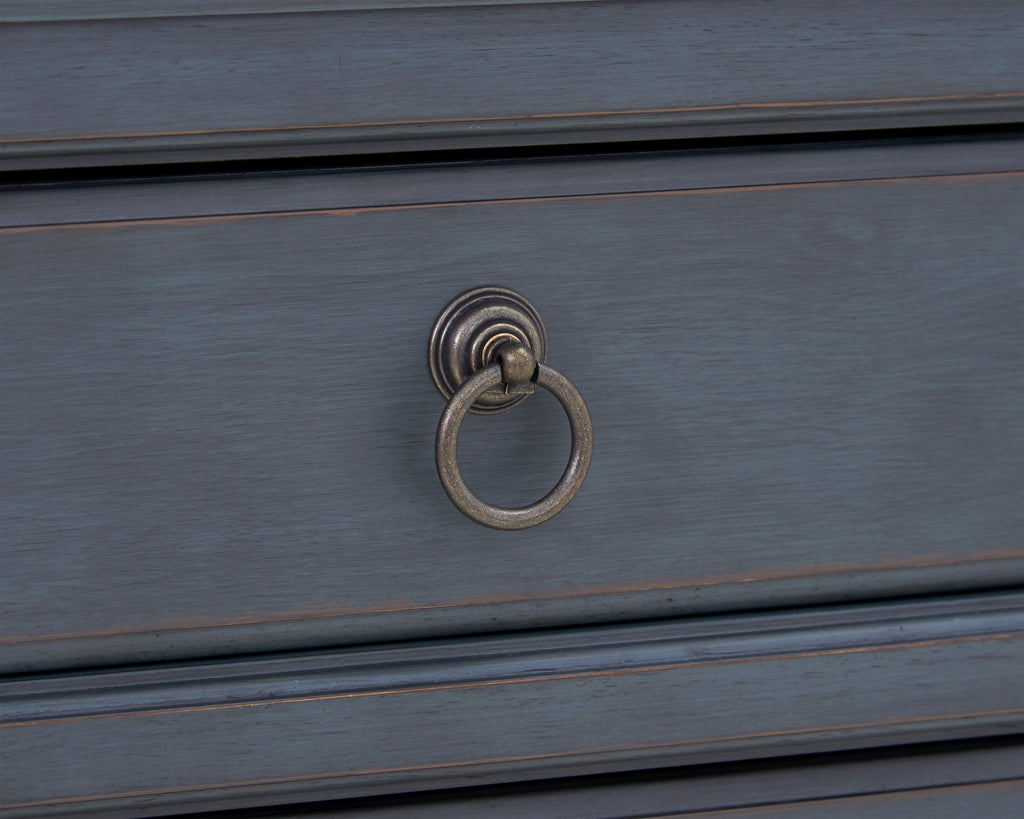 This Nightstand boasts a refreshing coastal twist on traditional style. Skillfully crafted from Rubberwood Solids and Birch Veneers, the subtle distressing Corduroy Blue finish and Antique Pewter hardware give this Bedside Chest an updated look with a timeless heirloom feel. Featuring three drawers, this Nightstand will provide plenty of storage space and an ideal spot for a bedside lamp and phone charger. Just like Baseball, Apple Pie and Rock & Roll, this Nightstand will become a beloved favorite in your home. Fully assembled upon arrival, this piece is ready to unbox and enjoy.
