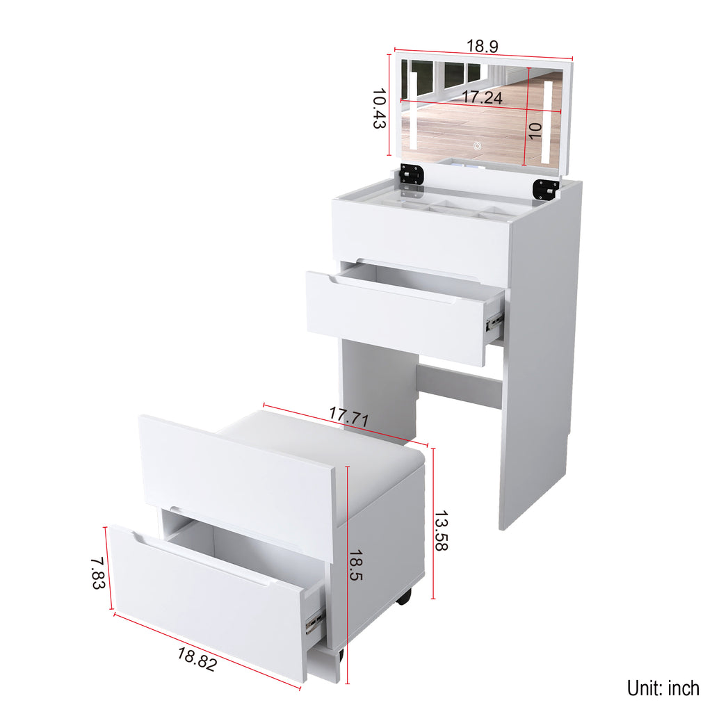 - Stylish Design: This Integrated Vanity features a modern and sleek design, with a flip top lighted mirror that adds a touch of elegance to any space. The vanity desk also has an internal storage area, allowing you to keep your makeup essentials organized and within reach.