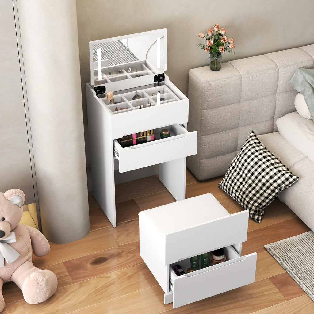 - 3 in 1 design :vanity, nightstand and chair are combined into a compact corner vanity-nightstand all in one. The vanity table also comes with a flip-up mirror, which flips open to be a simple vanity and closes to be a nightstand with great storage space, which is a more space-saving design