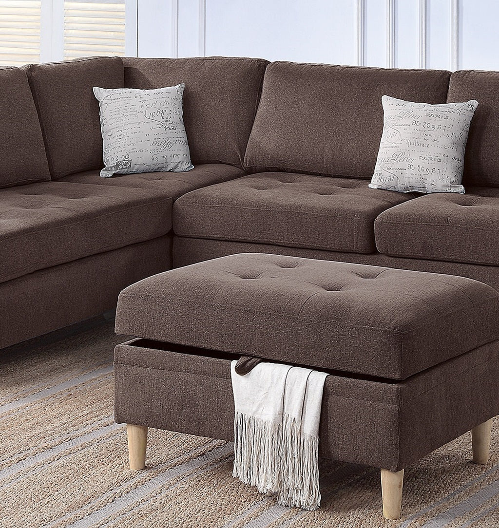 This elegant three-piece sectional sofa is the perfect centerpiece that ties your living space together. With the stylish wooden leg support and the beautiful design of the sofa, this set brings so much comfort to the modern home. The storage space in the cocktail ottoman provides extra space to store your favorite magazines and books. Available in neutral colors of Charcoal, Mushroom, and Chocolate. (Chenille).
