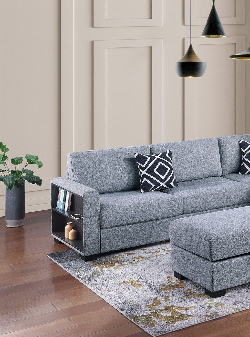 Whether you're unwinding after a long day or hosting a gathering, this 3-Piece Sectional Sofa with storage Ottoman promises to elevate your living experience with comfort, style, and practicality. Perfectly crafted for both style and functionality, this L-shaped sectional is the epitome of contemporary living. Whether you're lounging solo or entertaining guests, this sectional provides the ideal balance of softness and resilience, with its plush pillows and firm cushions. The standout feature of this sectional is its versatility. Sofa arms are equipped with integrated shelves, providing convenient storage space for books, remote controls, or decorative accents. This innovative design ensures that your essentials are always within reach, making it a practical choice for any home. Included with the sectional are two accent pillows, elegantly enhancing the overall look with their complementary colors and textures. They not only add a touch of sophistication but also invite you to sink into the deep comfort of the sectional. Completing the set is a stylish storage ottoman, perfect for resting your feet or using as extra seating when needed.