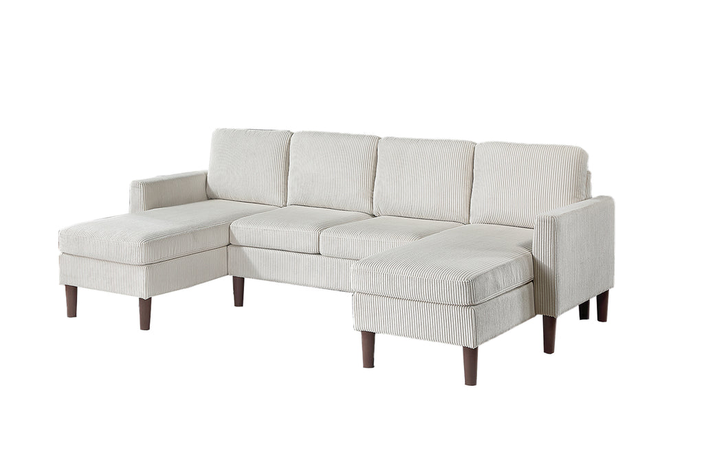 Enhance your home with the perfect combination of modern elegance and cozy relaxation. The dual chaises on either side create the ultimate relaxation zones, allowing multiple people to lounge at once without feeling crowded. Whether you're stretching out with a good book, enjoying a movie night, or entertaining guests, this sectional adapts effortlessly to your lifestyle. The armless two-seater section in the middle keeps the layout open and seamless, making the sectional feel even more spacious. Wrapped in soft and textured corduroy fabric, the sectional provides a plush, inviting feel that enhances both comfort and style. The deep ridges of the corduroy upholstery not only add a sophisticated touch but also create a warm and cozy atmosphere. The durable material ensures longevity, making it an excellent choice for everyday use. With its modern silhouette, the sectional features sleek square arms that give it a structured and contemporary look. With its luxurious corduroy upholstery, modern square arms, elegant tapered legs, and dual chaise seating, this sectional delivers the perfect combination of contemporary design and inviting comfort.