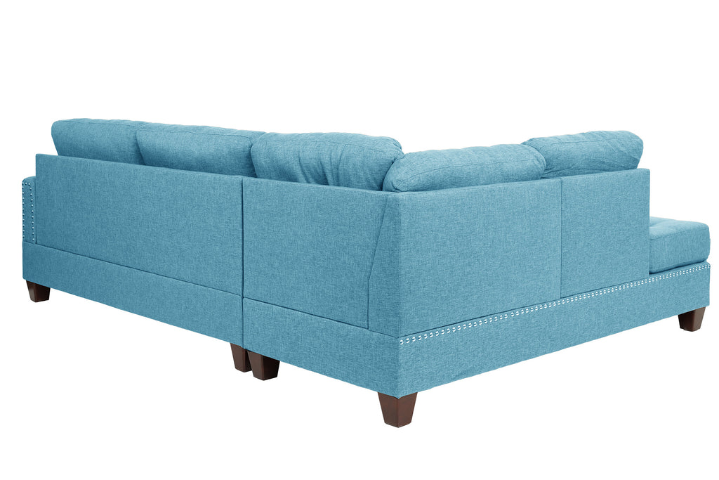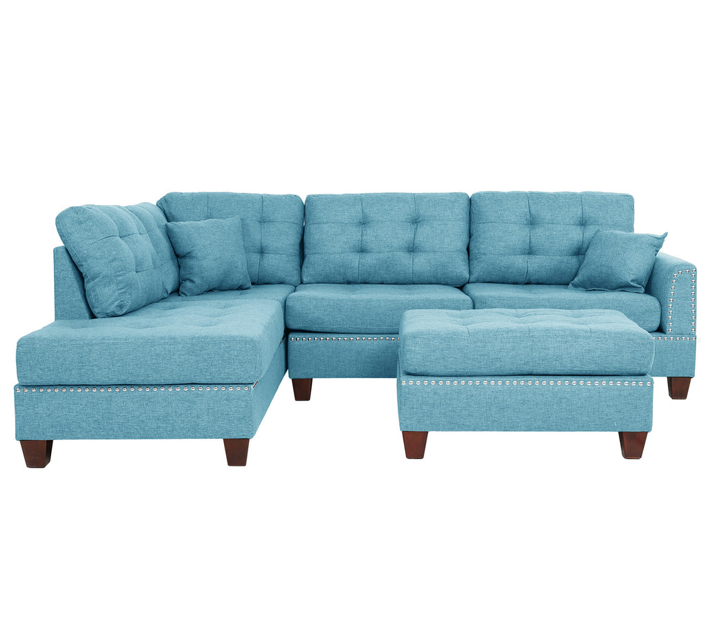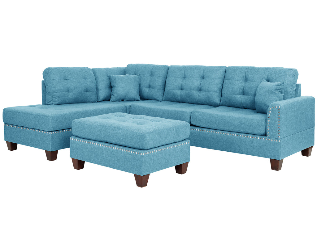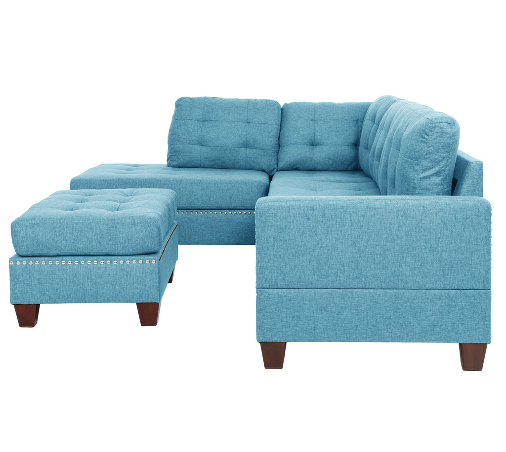 Bring comfort, flexibility, and style to your living room with this 3-piece sectional sofa set complete with a matching cocktail ottoman. Designed to fit seamlessly into any space, this sectional offers both functionality and a modern touch, making it the perfect centerpiece for gatherings, relaxation, or everyday lounging. The sectional includes a spacious sofa, a reversible chaise that can be set up on either the left or right side to suit your room’s layout, and a versatile ottoman that can be used as a footrest, extra seating, or a coffee table alternative. Its clean-lined silhouette is enhanced by tufted cushions and nailhead trim accents, giving it a chic yet inviting look. Crafted with a linen-like polyfiber material, this set combines a soft-to-the-touch feel with the resilience needed for daily use. The cushions are generously padded to provide comfort and support whether you’re stretched out on the chaise, relaxing with guests, or unwinding at the end of the day. The cocktail ottoman completes the set by offering an additional layer of convenience. It can be paired with the sectional to extend lounging space or positioned independently to suit your needs. Its tufted design ties the entire look together while providing versatile functionality. The matching cocktail ottoman serves as a multi-functional centerpiece. Use it to prop up your feet, as additional seating when entertaining, or pair it with a tray to hold drinks and snacks. Its tufted top and matching nailhead trim give it a refined look that ties seamlessly with the sectional. Whether for casual lounging, movie nights, or gatherings with family and friends, this set delivers a stylish foundation for your home.