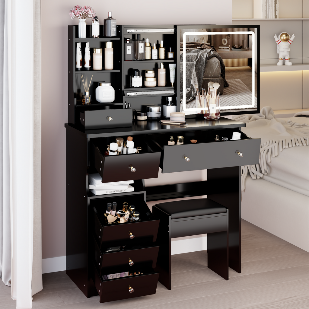 - [37' length, equipped with a 24'x22' sliding vanity mirror]: The length of the vanity table is 37', the width is 15.7', and the height is 54', equipped with a 24'x22' sliding vanity mirror. It has a large desktop and high storage capacity, suitable for adult use. It requires a lot of space.