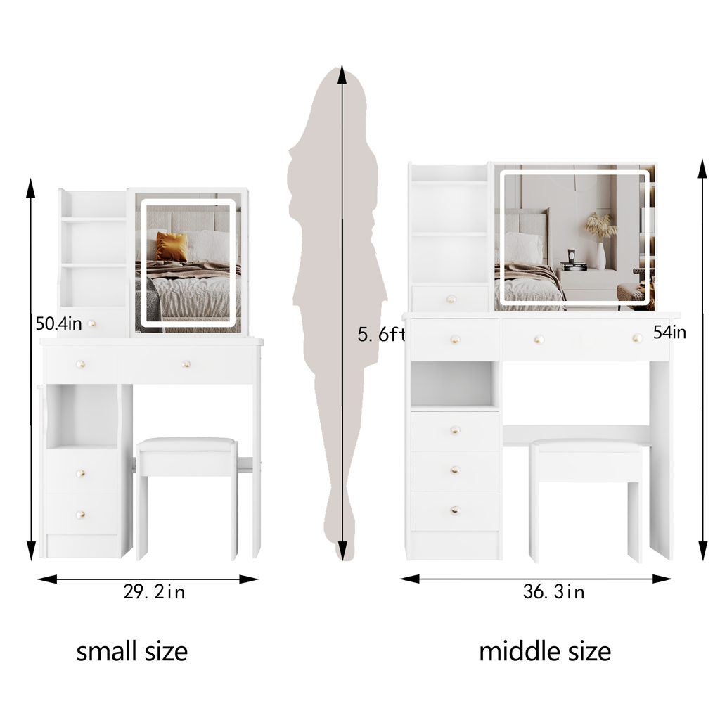 - [37' length, equipped with a 24'x22' sliding vanity mirror]: The length of the vanity table is 37', the width is 15.7', and the height is 54', equipped with a 24'x22' sliding vanity mirror. It has a large desktop and high storage capacity, suitable for adult use. It requires a lot of space.
