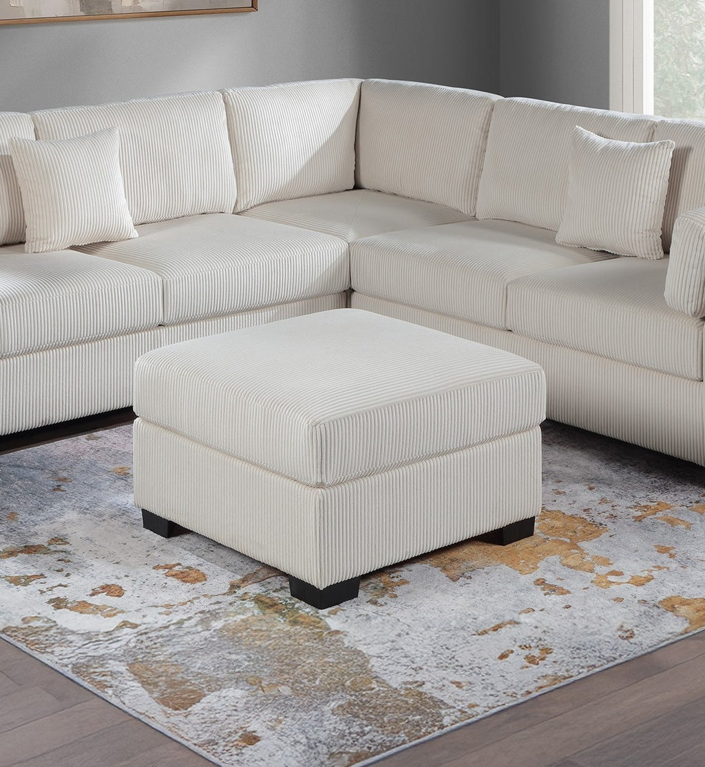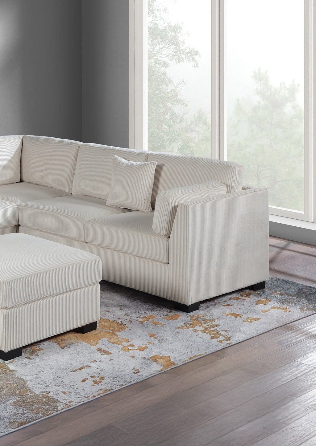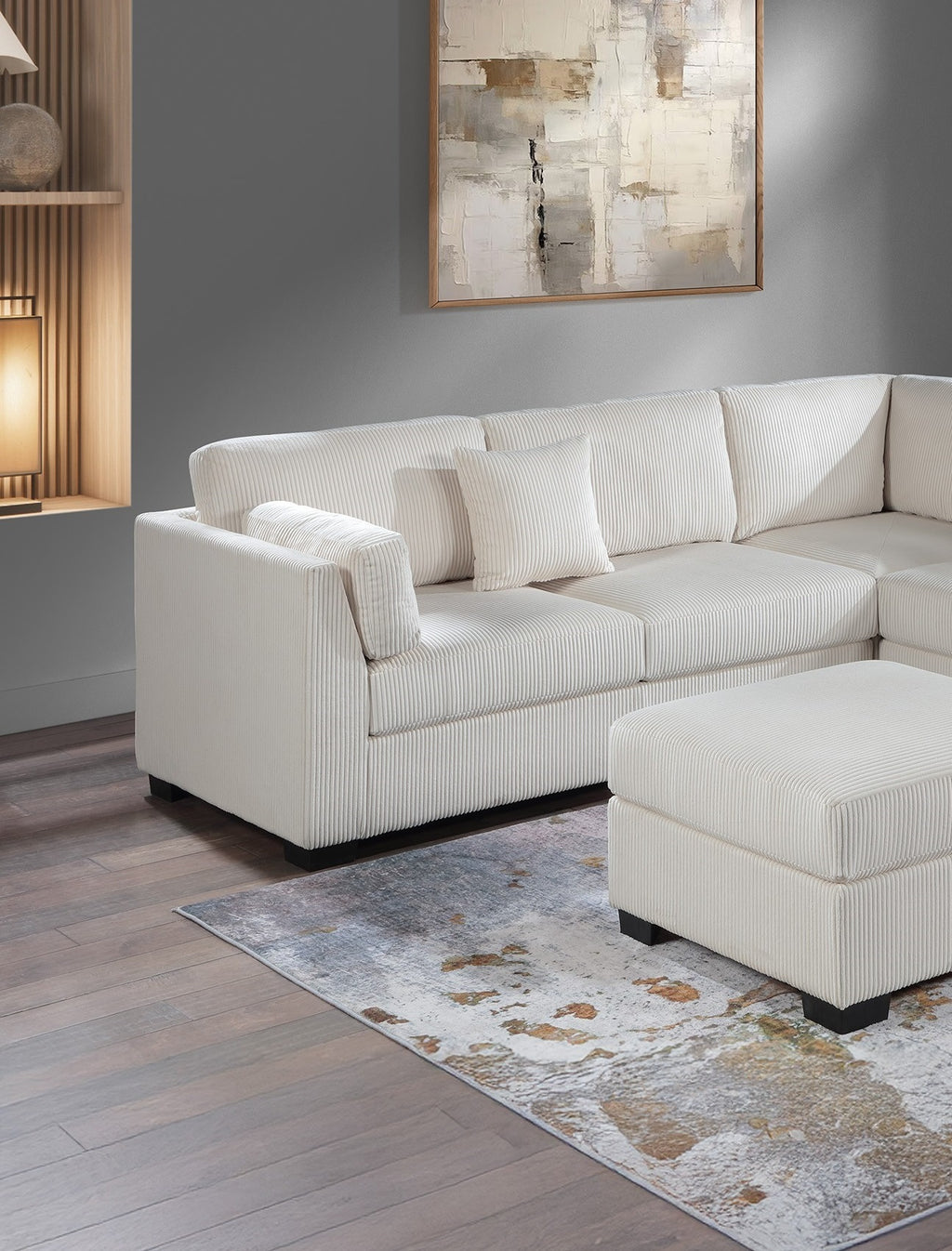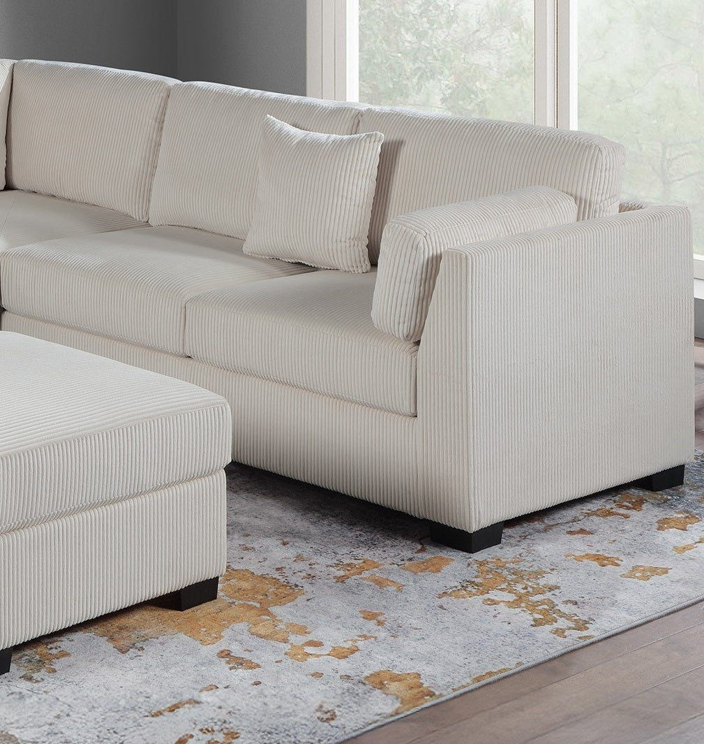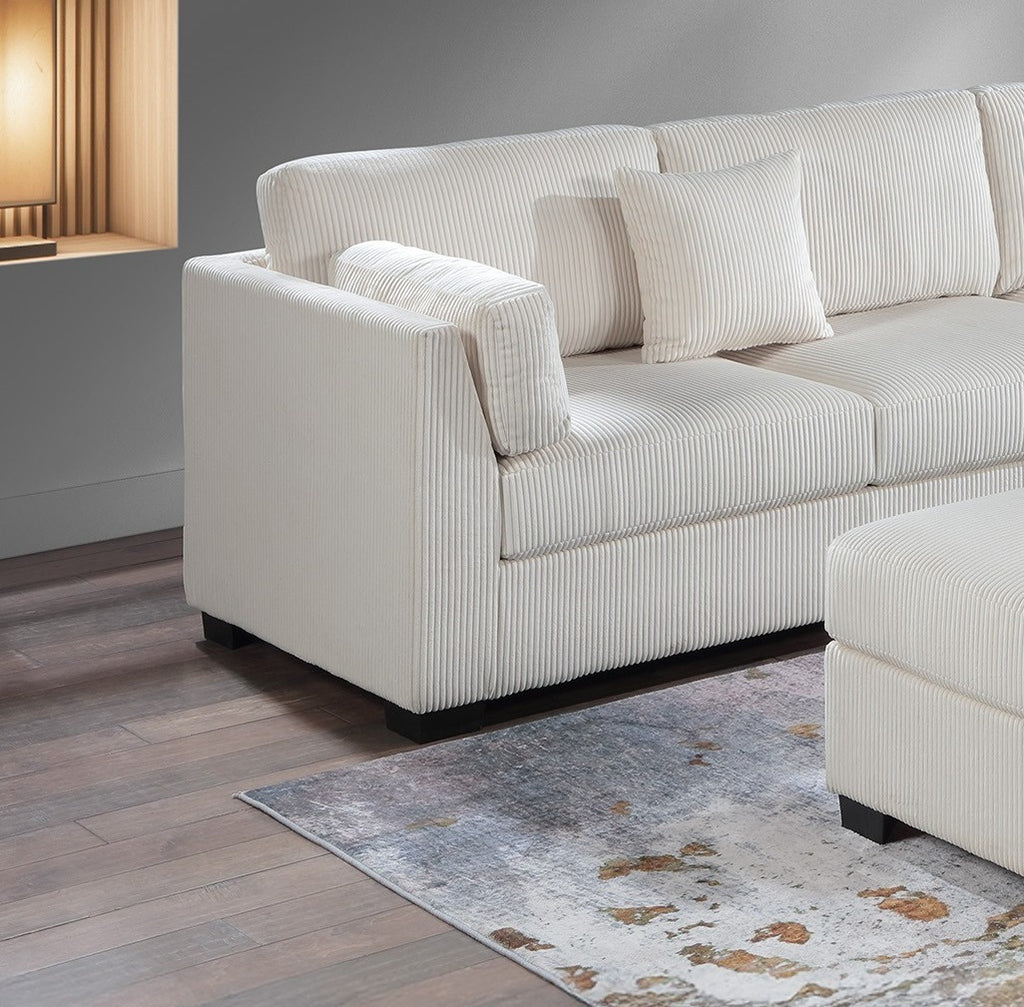 The 4-Piece L-Shaped Sectional Set with Ottoman brings a perfect combination of modern design and inviting comfort to any living space. Upholstered in luxuriously soft corduroy, this sectional offers a cozy yet sophisticated feel, making it the ideal centerpiece for relaxation and style. The L-shaped layout design optimizes both seating and room arrangement, perfect for lounging, entertaining, or unwinding after a long day. This sectional set includes a right-arm or left-arm one-arm loveseat, a corner wedge and a matching ottoman. The ottoman serves as a versatile addition, functioning as a footrest, an extra seat, or even a stylish coffee table alternative when paired with a tray. Designed with comfort in mind, this sectional features plush back cushions that provide soft, supportive seating for hours of relaxation. Two included throw pillows enhance the cozy appeal, while the two small side cushions offer additional arm support, ensuring a more comfortable lounging experience. The low-profile legs create a sleek and grounded look, adding to the sectional’s modern aesthetic. While the textured corduroy upholstery introduces warmth and a refined touch to any décor. Whether placed in a contemporary, minimalist, or cozy living room setting, this sectional adapts effortlessly, making it a versatile and stylish choice for any home.