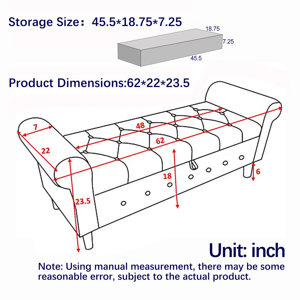 - Dimensions: the bench is 62 inches wide, 22 inches deep, 23.5 inches high, the seat is 48 inches wide and sits 18 inches high. Storage size: 45.5*18.75*18.75*7.25 inches.