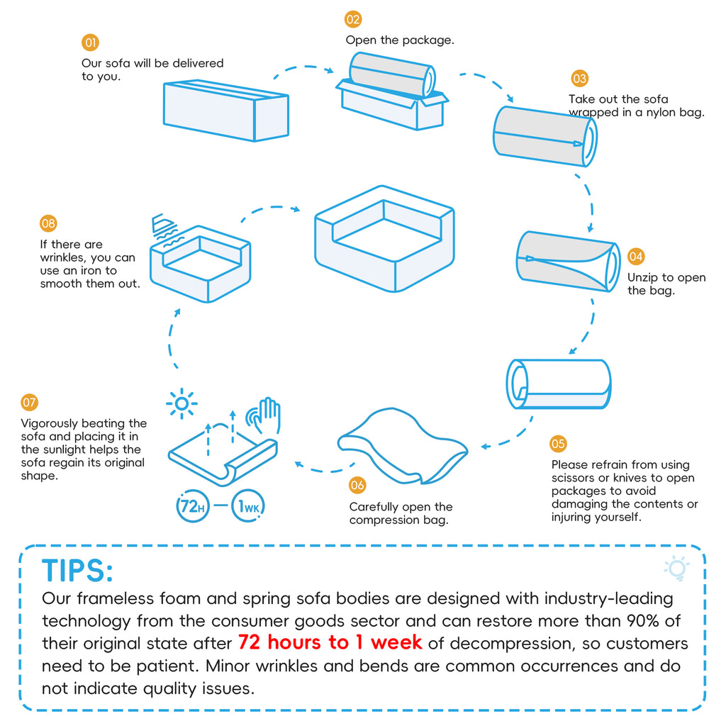 - Fully Compressed Sofa: The sofa comes fully compressed, making it incredibly easy to Move and store. Its compact packaging ensures that it can be shipped more efficiently and fits through narrow spaces, such as doorways or stairwells. At the same time, no wooden frame design of this sofa reduces the risk of danger in case of bumps and knocks, making it more suitable for families with children, the elderly, or pets,ensuring safety for users.