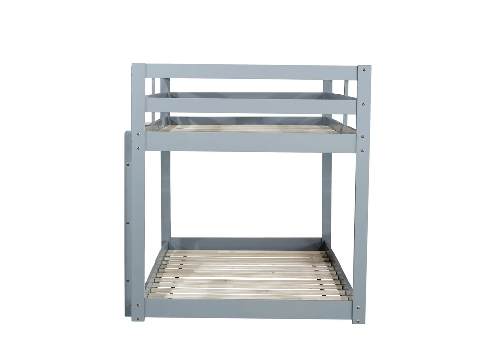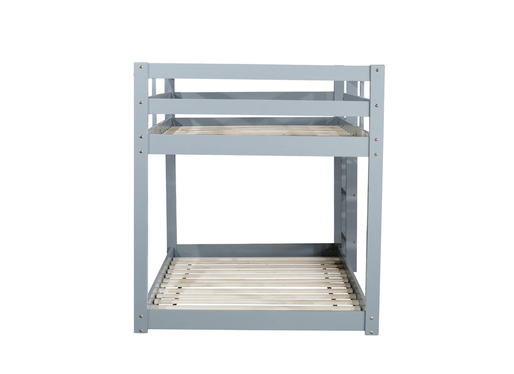 This twin over twin floor bunk bed emphasis on the elegance and simplicity. The expansive area beneath the bunk bed boasts a versatile framework, allowing for various utilizations. With the quality bed material and solid stability, this low height bunk bed has great capacity in creating many comfortable and relaxing nights.