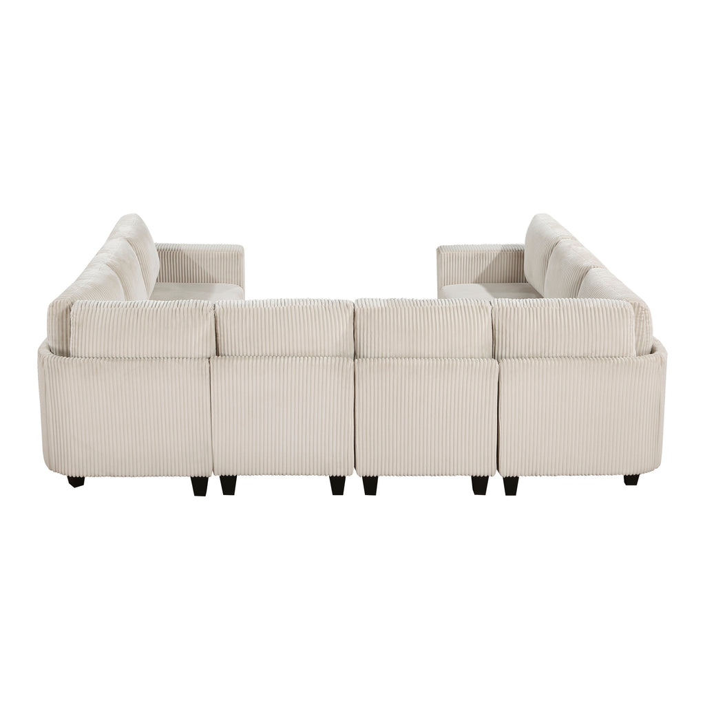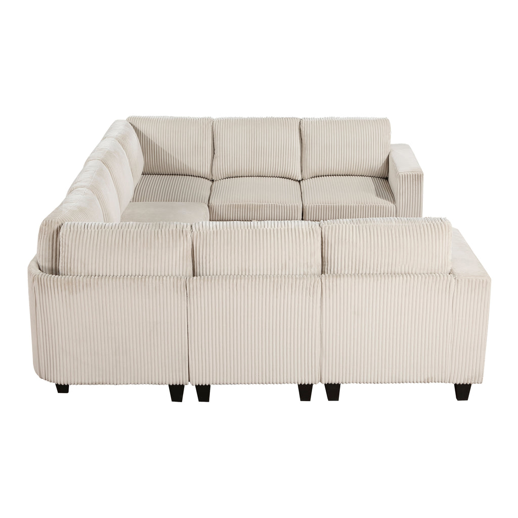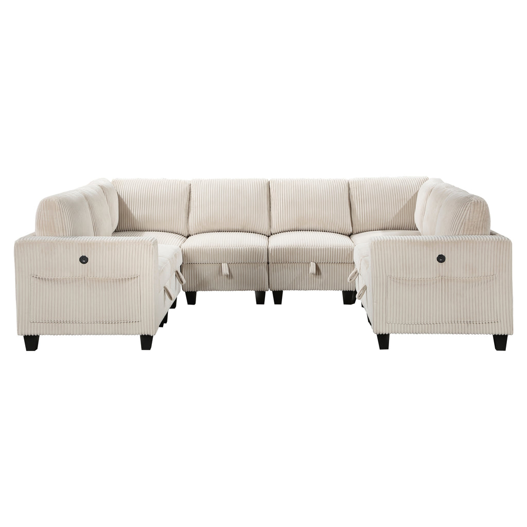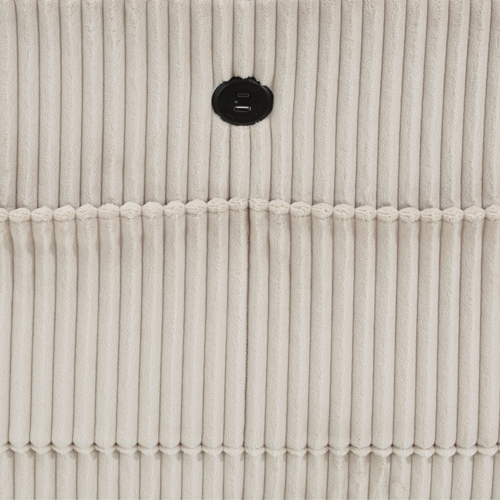 The multifunctional design of the Walterboro Collection creates a seating group that is not only configurable to your available space but serves as a convenient storage spot within your casual living room. Pull-out storage drawers are neatly tucked beneath the armless chairs, and end seats of the sectional, each drawer easily accessible with a pull to the front-mounted loop handle. The two corner seating units of the sectional bookend four armless chairs while two end seats arm's provide side support and power charging ports. The collection is covered in beige corduroy fabric for a neutral complement to your home’s décor.