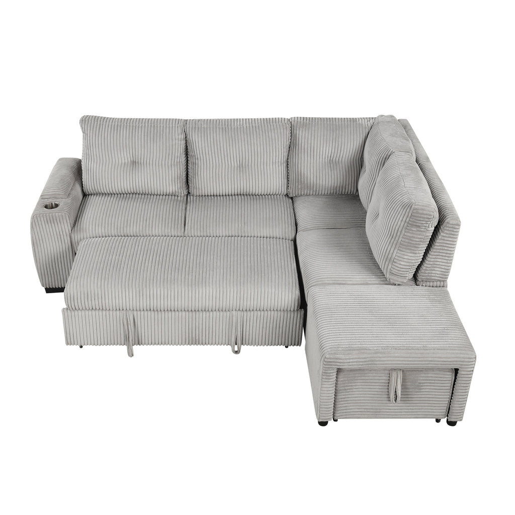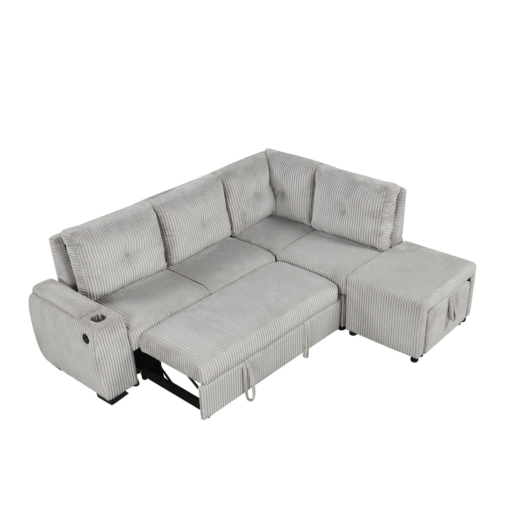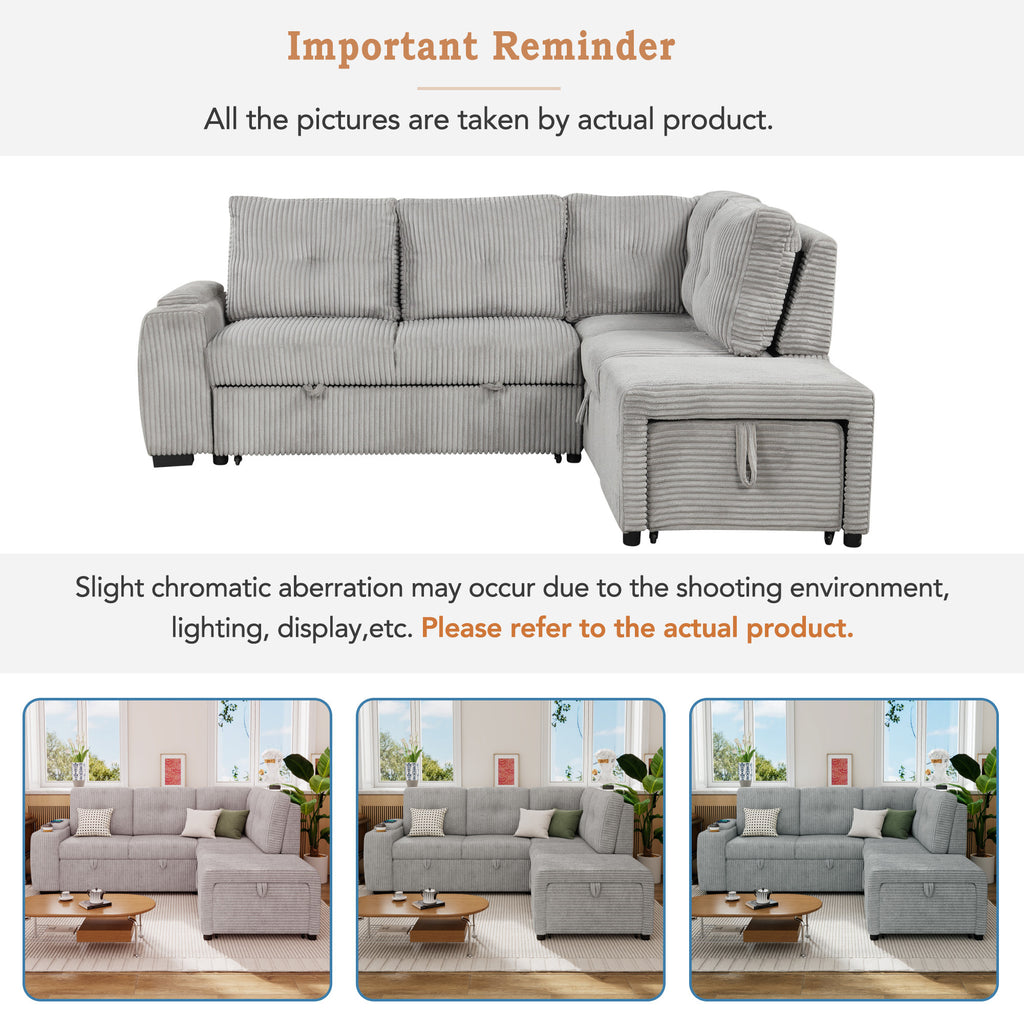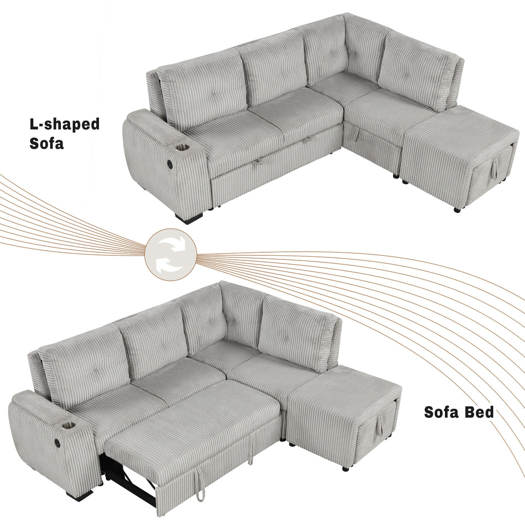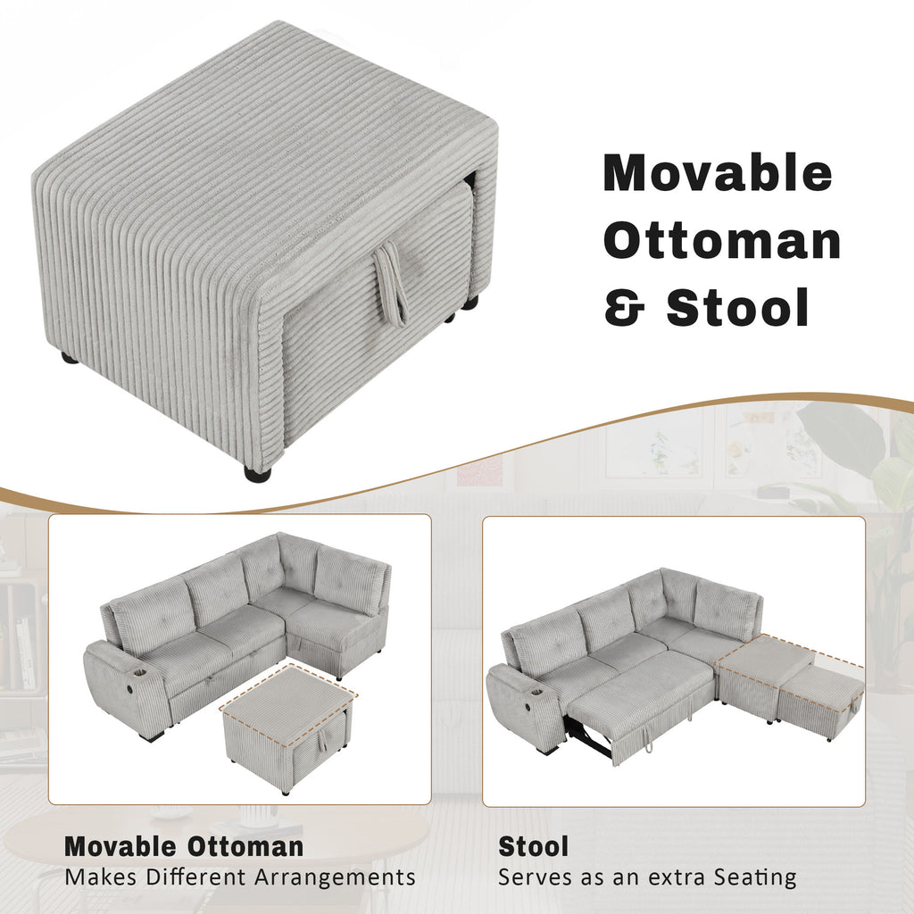 This versatile sofa bed combines comfort, functionality, and style to enhance any living space. Upholstered in high-quality corduroy fabric, it offers a soft, breathable, and skin-friendly seating experience, while the high-density foam cushions provide superior support and comfort. Designed with convenience in mind, it features a quick conversion mechanism that easily transforms the sofa into a spacious bed, perfect for accommodating guests. The sofa also includes a hidden storage compartment in the armrest and a large under-seat storage area, ideal for keeping your living area organized and clutter-free. For added convenience, two built-in USB ports allow you to charge devices without needing to search for an outlet, while a built-in cup holder ensures drinks and snacks are always within reach. The movable ottoman and stool provide flexible seating and additional storage options, all while maintaining a compact footprint. Whether you're lounging, hosting guests, or looking for extra storage, this sofa bed offers an all-in-one solution to maximize comfort and space in your home.
