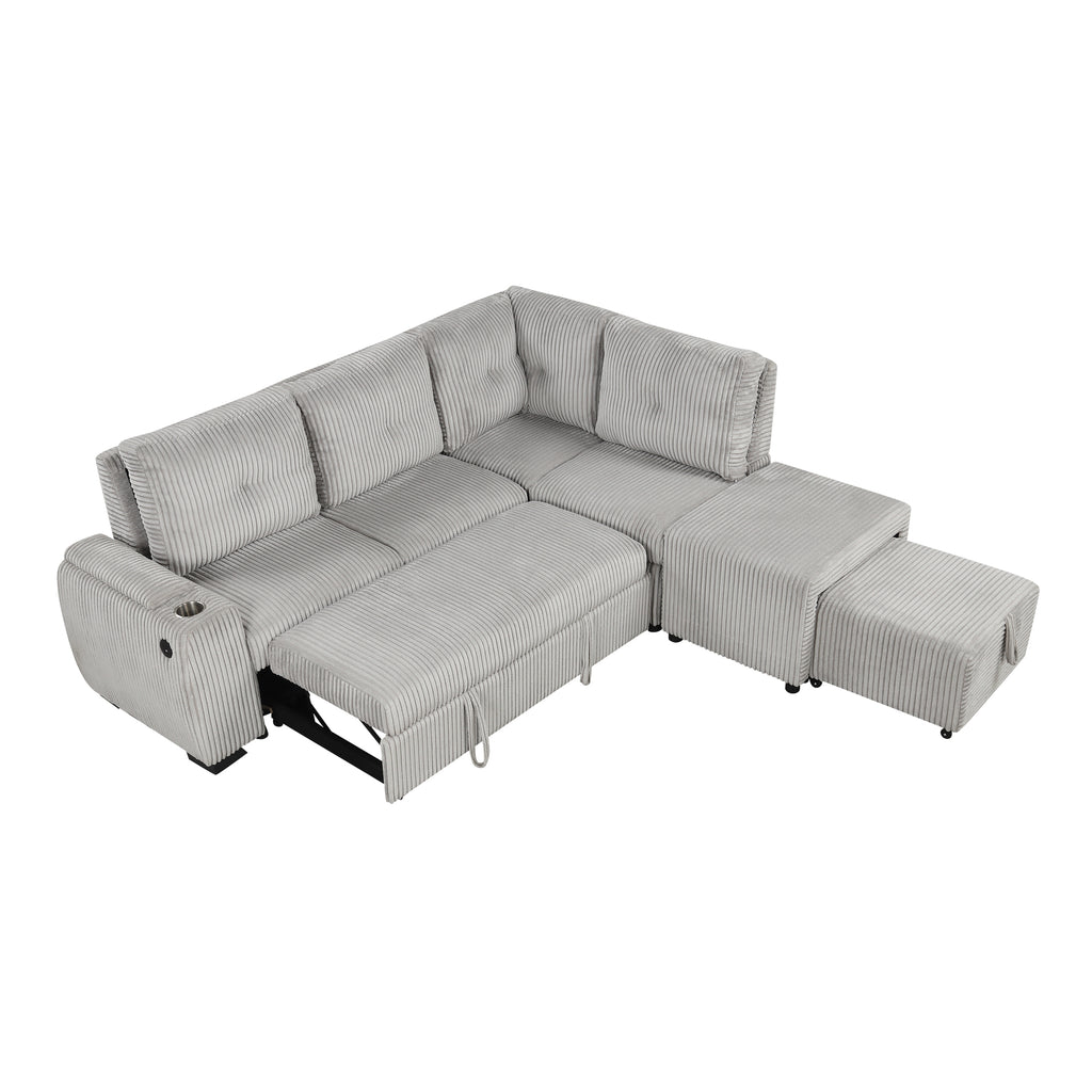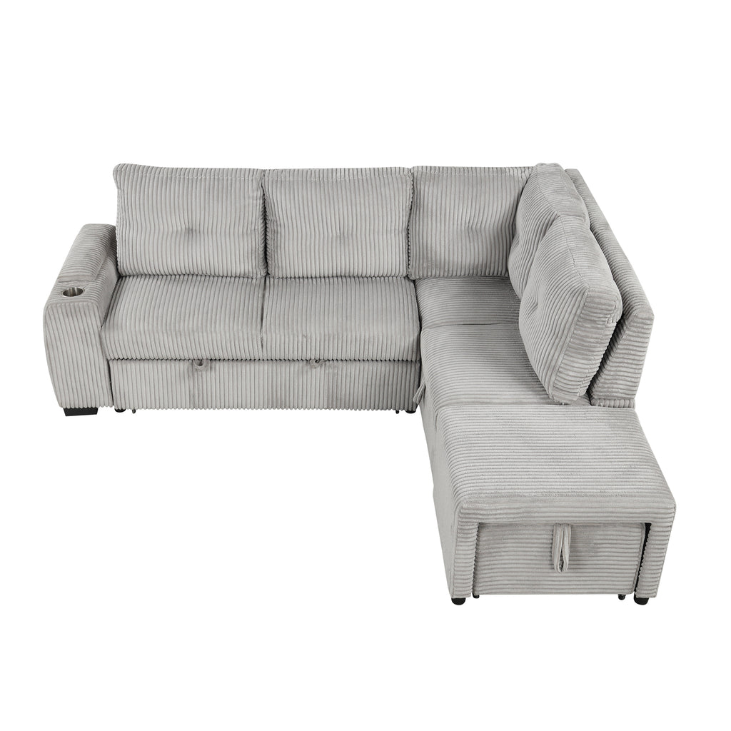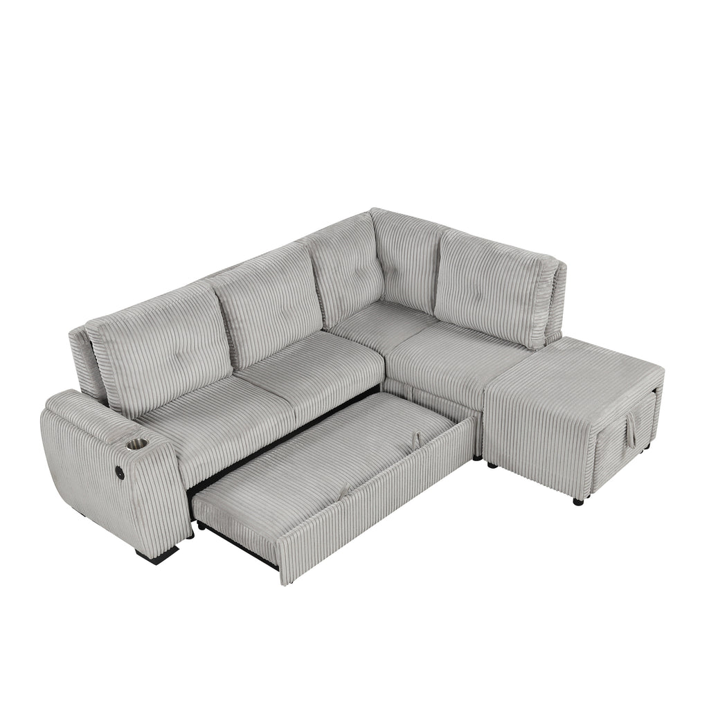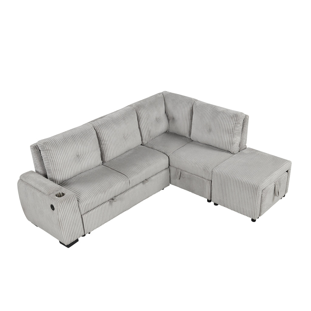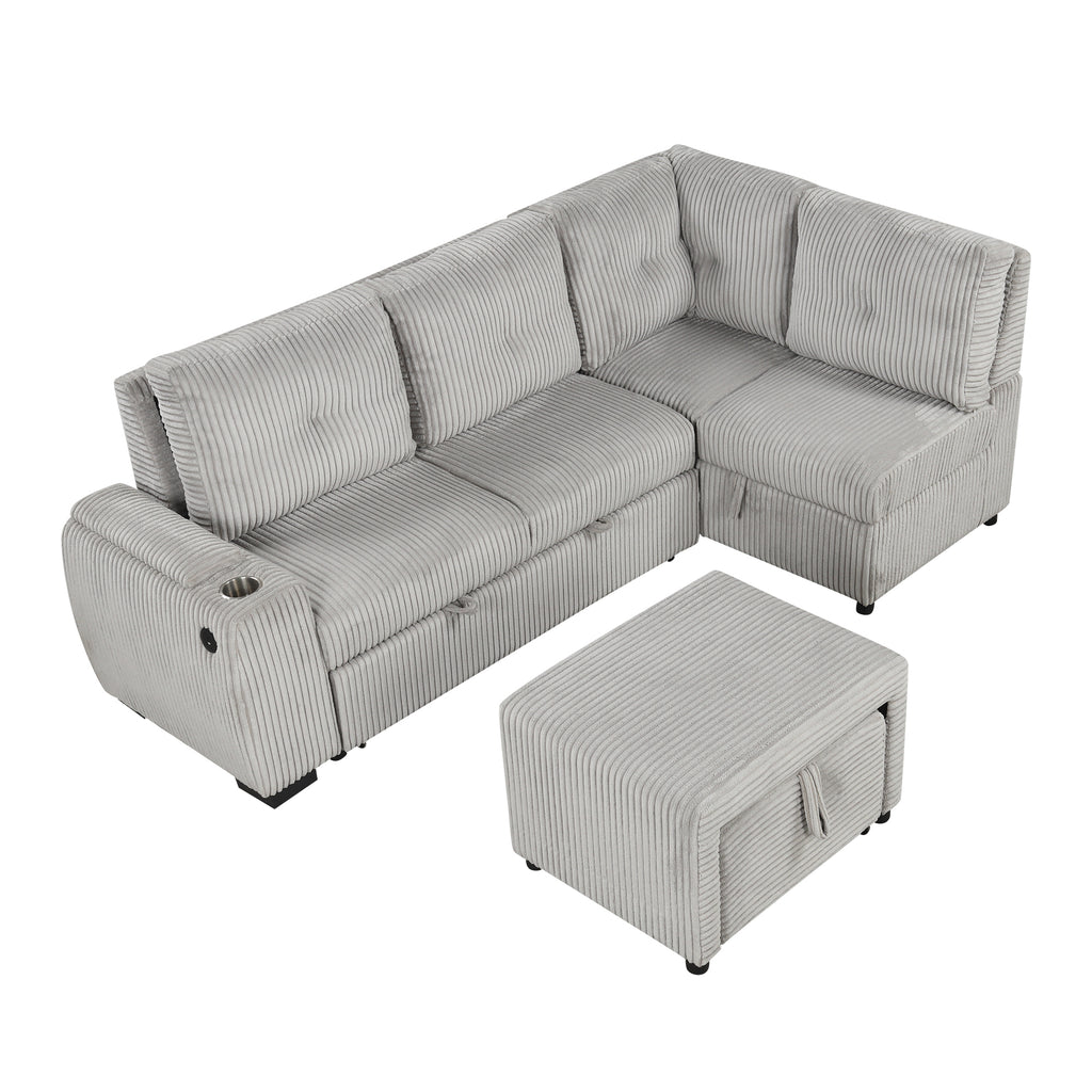 This versatile sofa bed combines comfort, functionality, and style to enhance any living space. Upholstered in high-quality corduroy fabric, it offers a soft, breathable, and skin-friendly seating experience, while the high-density foam cushions provide superior support and comfort. Designed with convenience in mind, it features a quick conversion mechanism that easily transforms the sofa into a spacious bed, perfect for accommodating guests. The sofa also includes a hidden storage compartment in the armrest and a large under-seat storage area, ideal for keeping your living area organized and clutter-free. For added convenience, two built-in USB ports allow you to charge devices without needing to search for an outlet, while a built-in cup holder ensures drinks and snacks are always within reach. The movable ottoman and stool provide flexible seating and additional storage options, all while maintaining a compact footprint. Whether you're lounging, hosting guests, or looking for extra storage, this sofa bed offers an all-in-one solution to maximize comfort and space in your home.