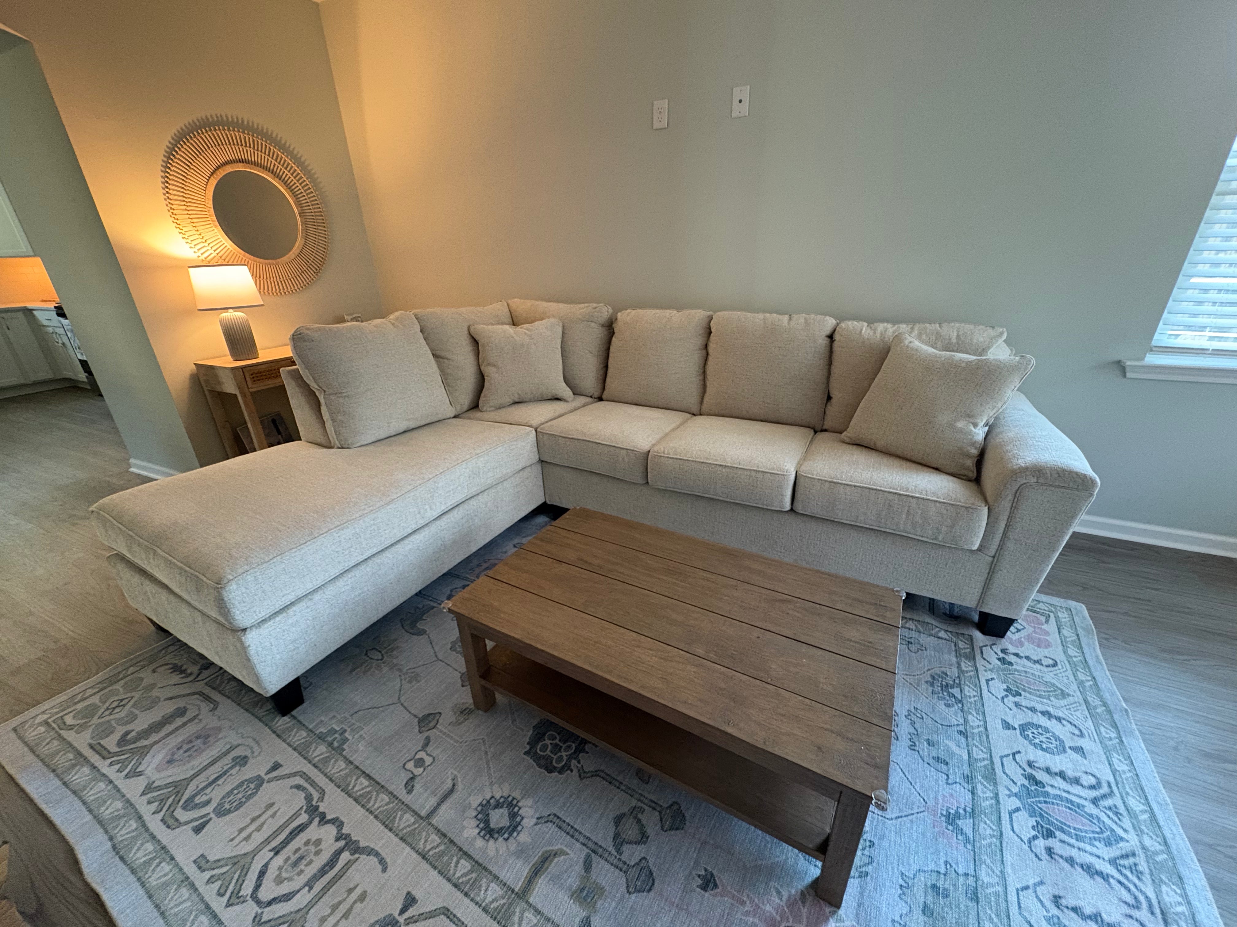 If you’re looking to lighten the mood, you’re sure to find this budget-conscious sectional sleeper beautifully fits the bill. Covered in a creme chenille upholstery loaded with plush texture, this less-is-more contemporary sectional is dressed to impress with angled side profiling and a track arm wrapped with a layer of pillowy softness for that little something extra. Open-ended chaise adds to this sectional’s swank look. Full-size memory foam mattress comfortably accommodates overnight guests.