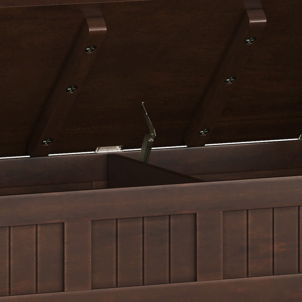 - Features lift up lid that opens using safety hinges to expose 2 large internal storage compartments and an open bottom shelf for extra storage