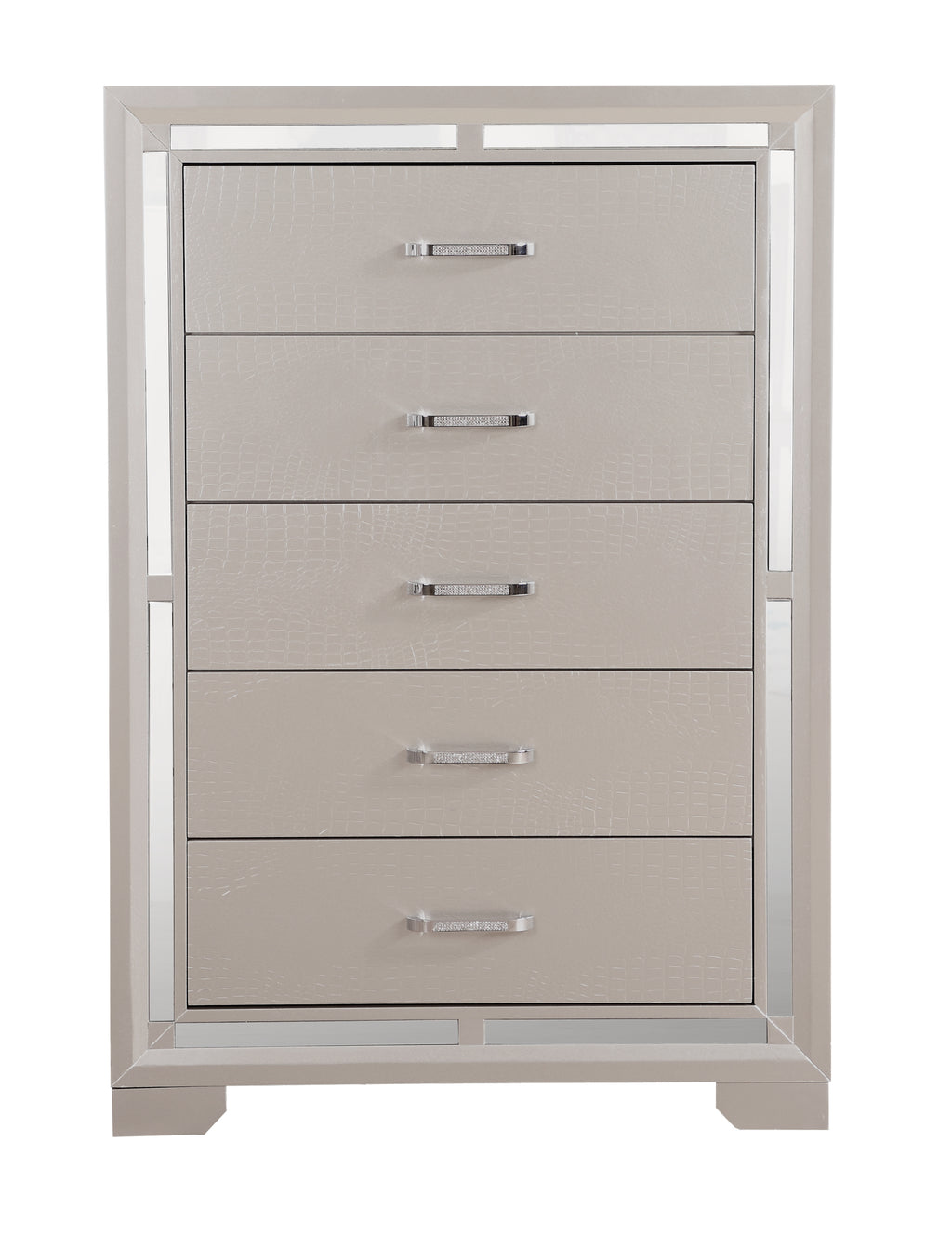 - Mirror Accents and Croc Finish are Featured on this Classic Glam Look. Large Scale Design and Deep Drawers add to this Stunning Group. Matching Beds are also Available