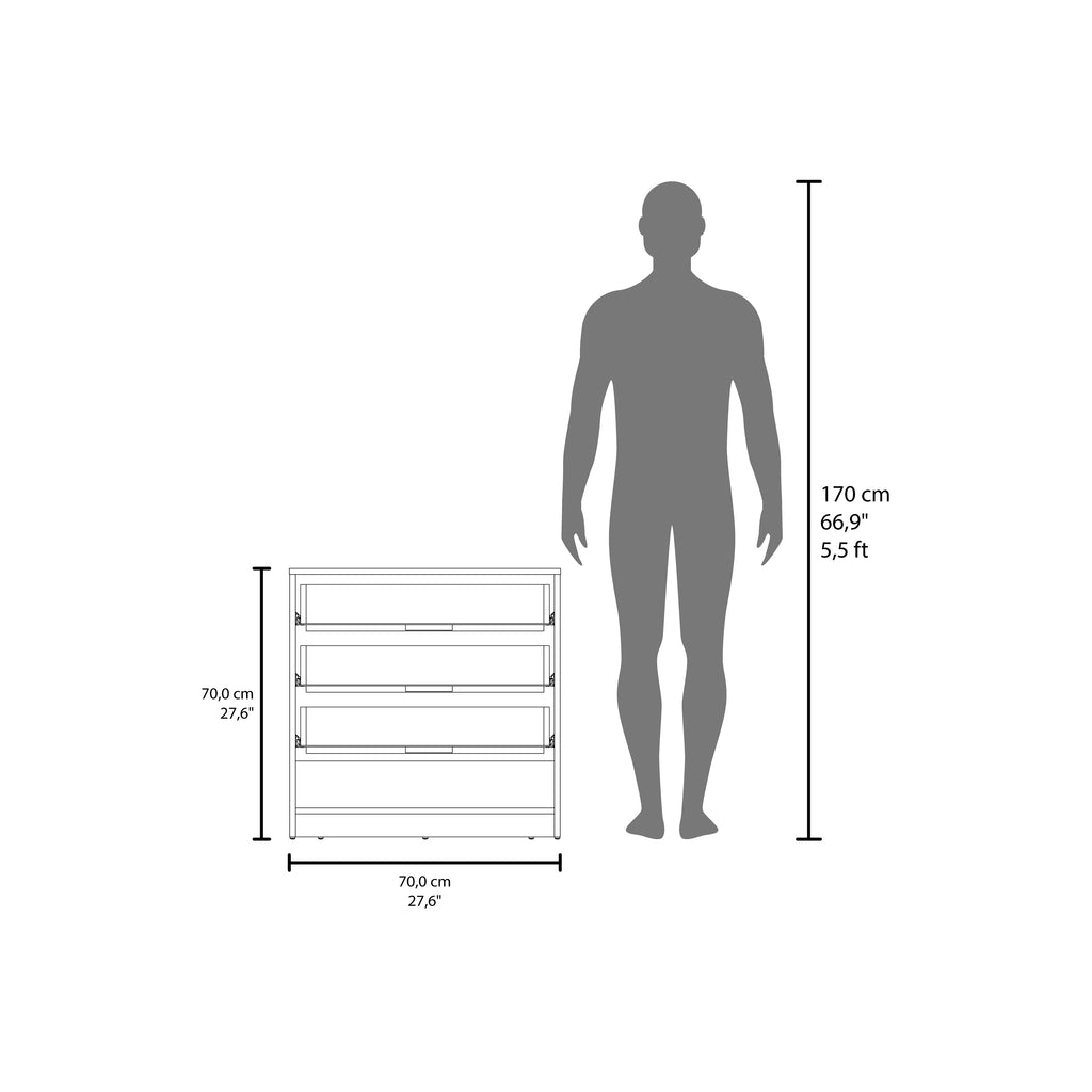 - Three smooth-glide drawers offer generous storage for clothes, accessories, or linens.