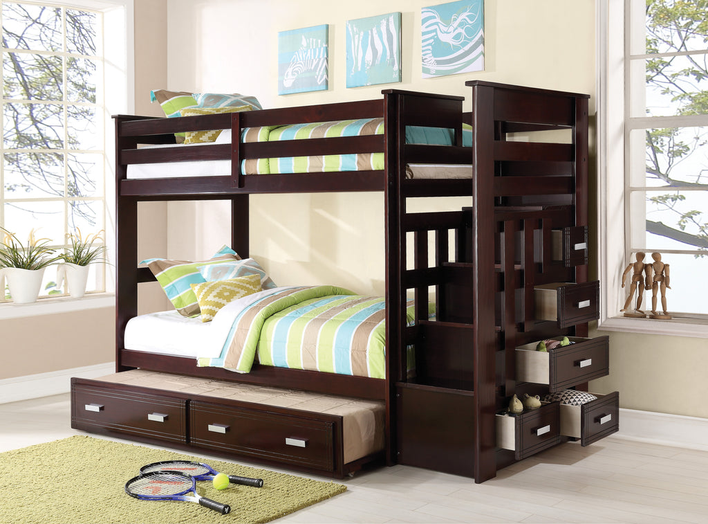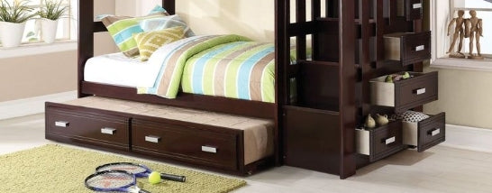 Maximize space with our Espresso Twin/Twin Bunk Bed featuring a versatile trundle and right-facing storage ladder with five integrated drawers. Crafted from durable wood and synthetic wood, this bunk ensures safety with a full-length guard-rail for the upper bunk. The convertible trundle easily transforms from an extra bed to oversized storage, making it perfect for any child's room.