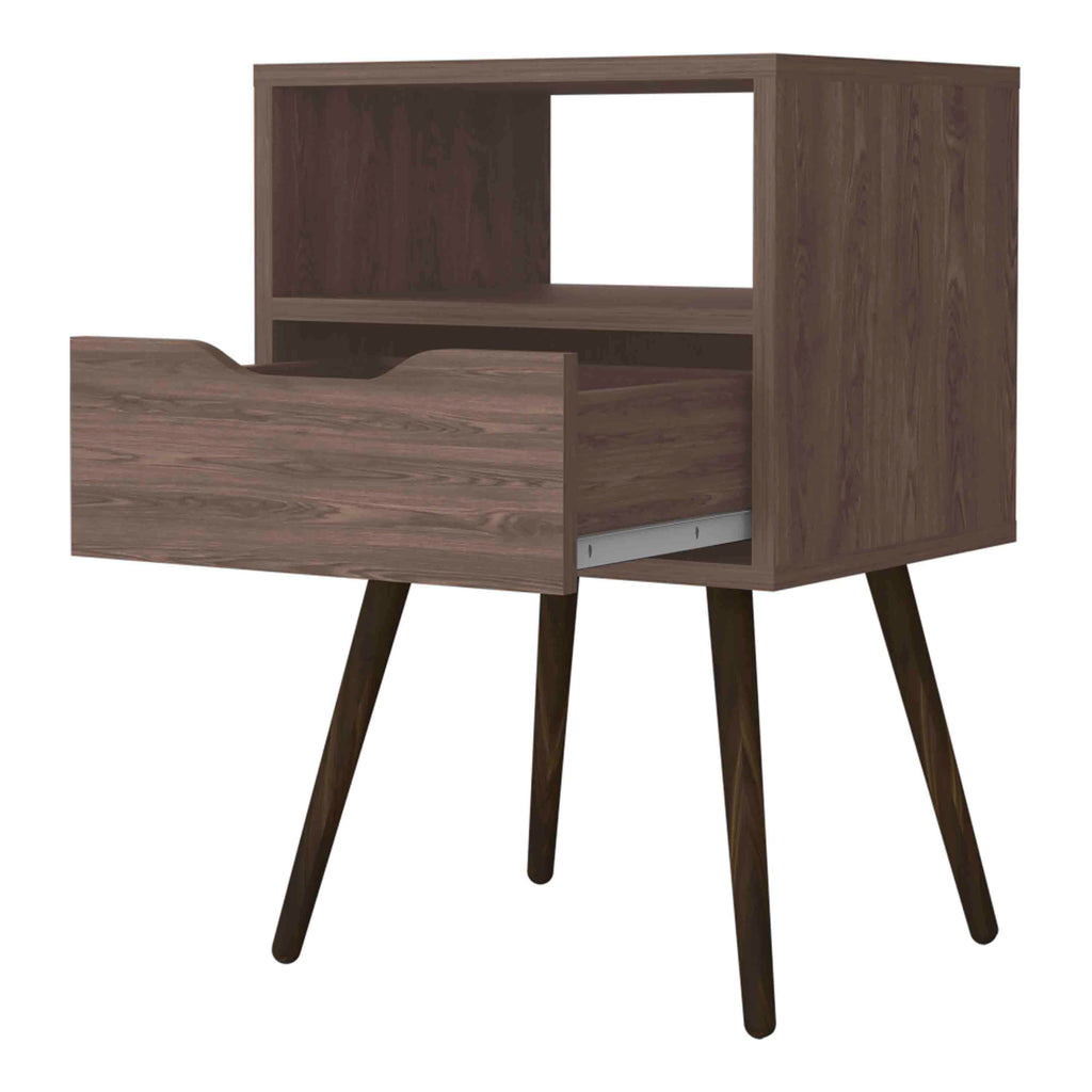 This nightstand has a modern and contemporary style for its four legs, giving a unique touch to your room. You can use it in your room or in the place you prefer; it works perfectly in any space! With a perfect Superior Top (20,9'') to display your favorite decorations or your books, it also has an ideal shelf for smaller objects, as well as a perfect drawer for your most precious things and one open shelf (5,5''H X 14,5''W)