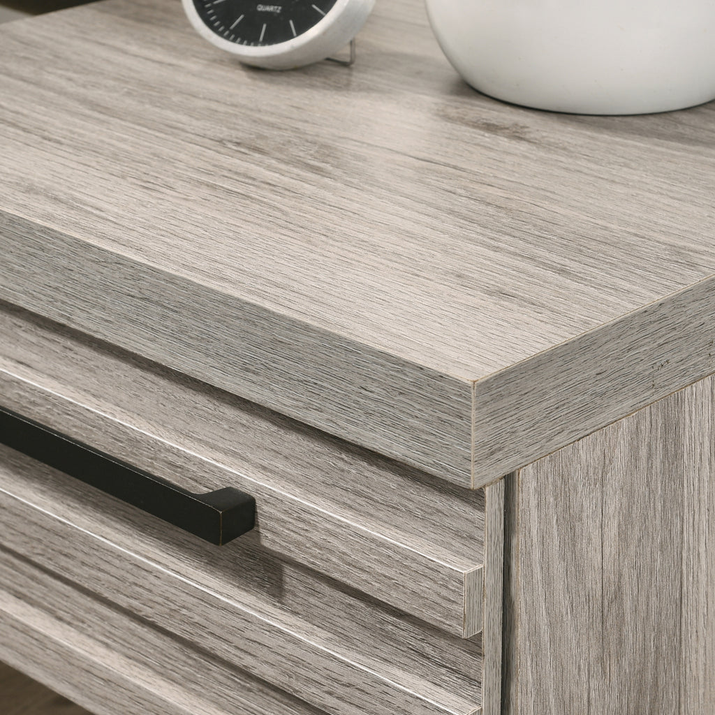 Complete your bedroom look with the Alvear Contemporary Wood Nightstand with Metal Base, Weathered Gray. Crafted with wood and clean, easy lines, this generously appointed nightstand is as soft and sleek as it is practical. The elegant wood-grained laminate ash gray finish is subtly weathered. The roomy drawer provides plenty of places to store your belongings by your bedside. Slim linear pulls in black are a modern finish. Sturdy engineered wood and a sturdy metal base make this a piece of furniture for the ages. Some assembly is required.
