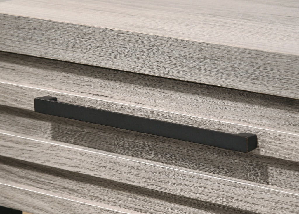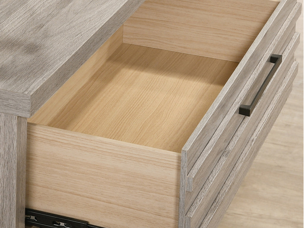 - English dovetail construction drawers on smooth ball-bearing glides. The drawer features a slatted style drawer face