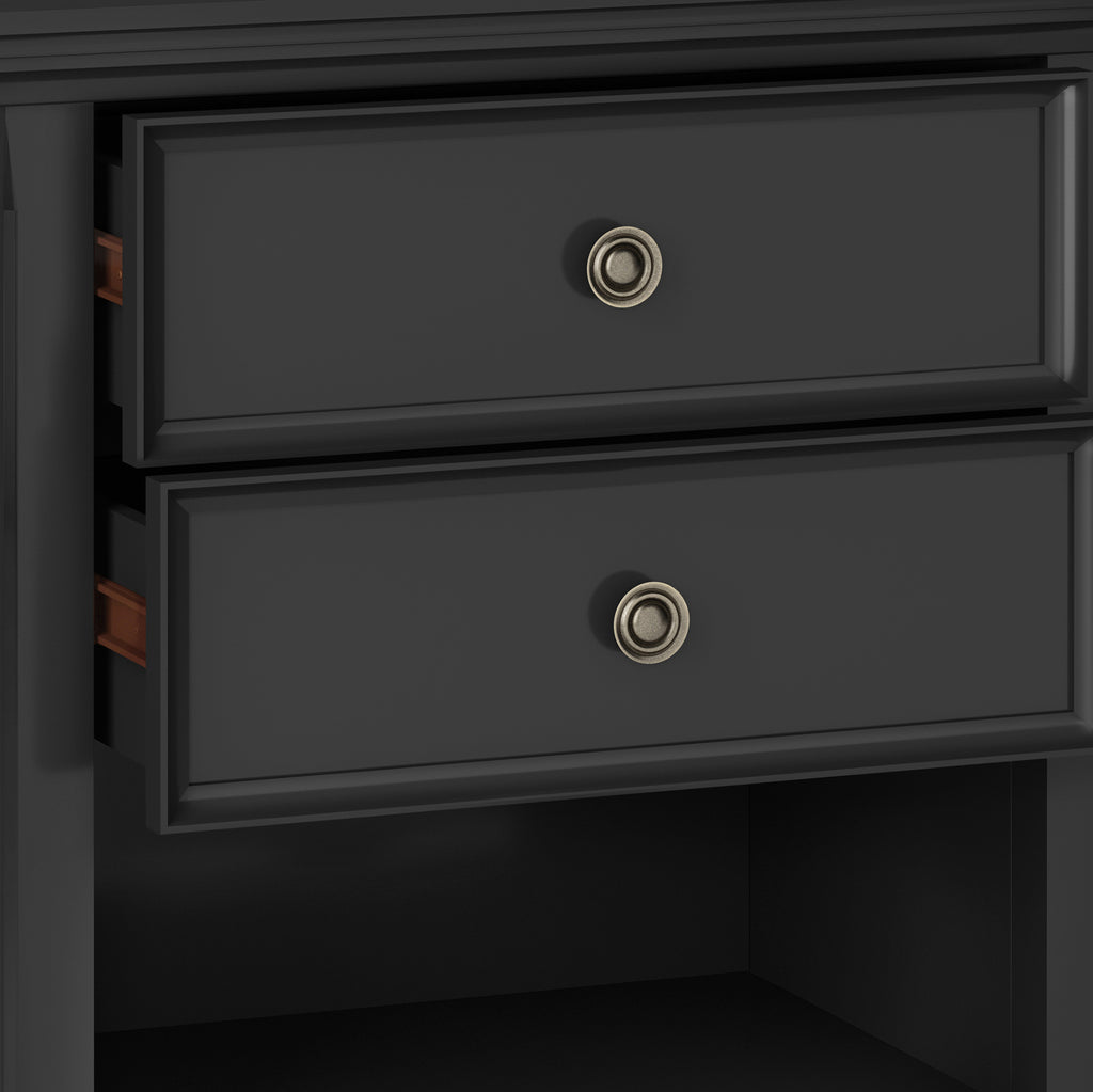 - Features two (2) spacious drawers with metal drawer glides and open bottom storage area