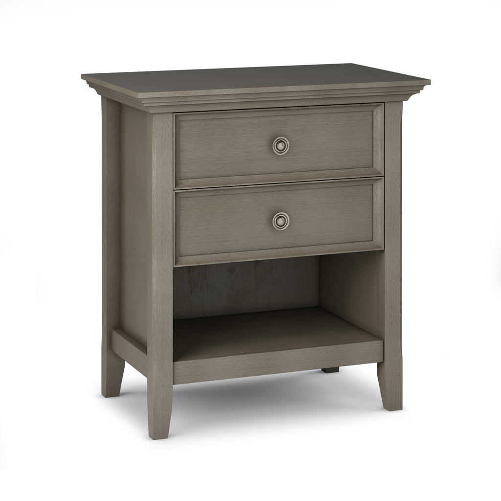 - Features two (2) spacious drawers with metal drawer glides and open bottom storage area