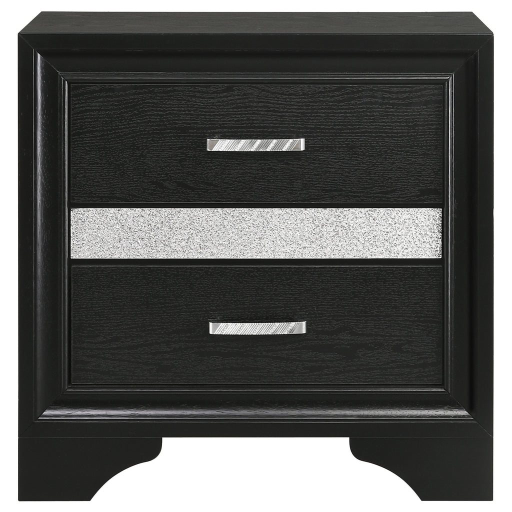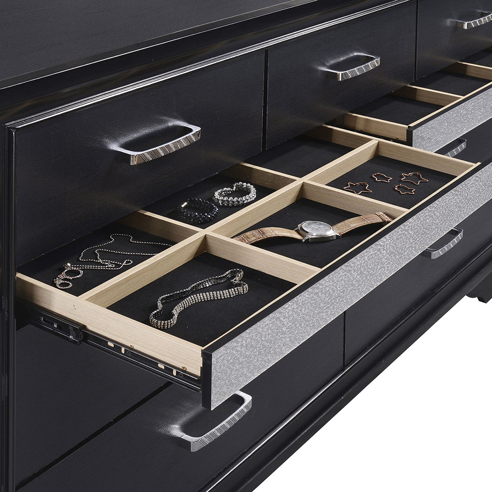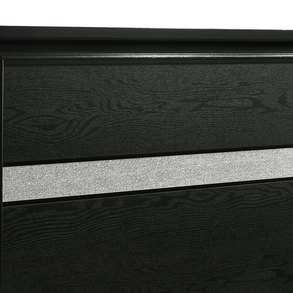 Designed for the perfect balance of glamour and functionality, this modern bedroom set captures attention with crystal-inspired embellishments and a smooth black wood grain finish. Plenty of drawers, including in the bed's footboard, ensure easy organization for clothing, linens and more to keep your room looking it's best.