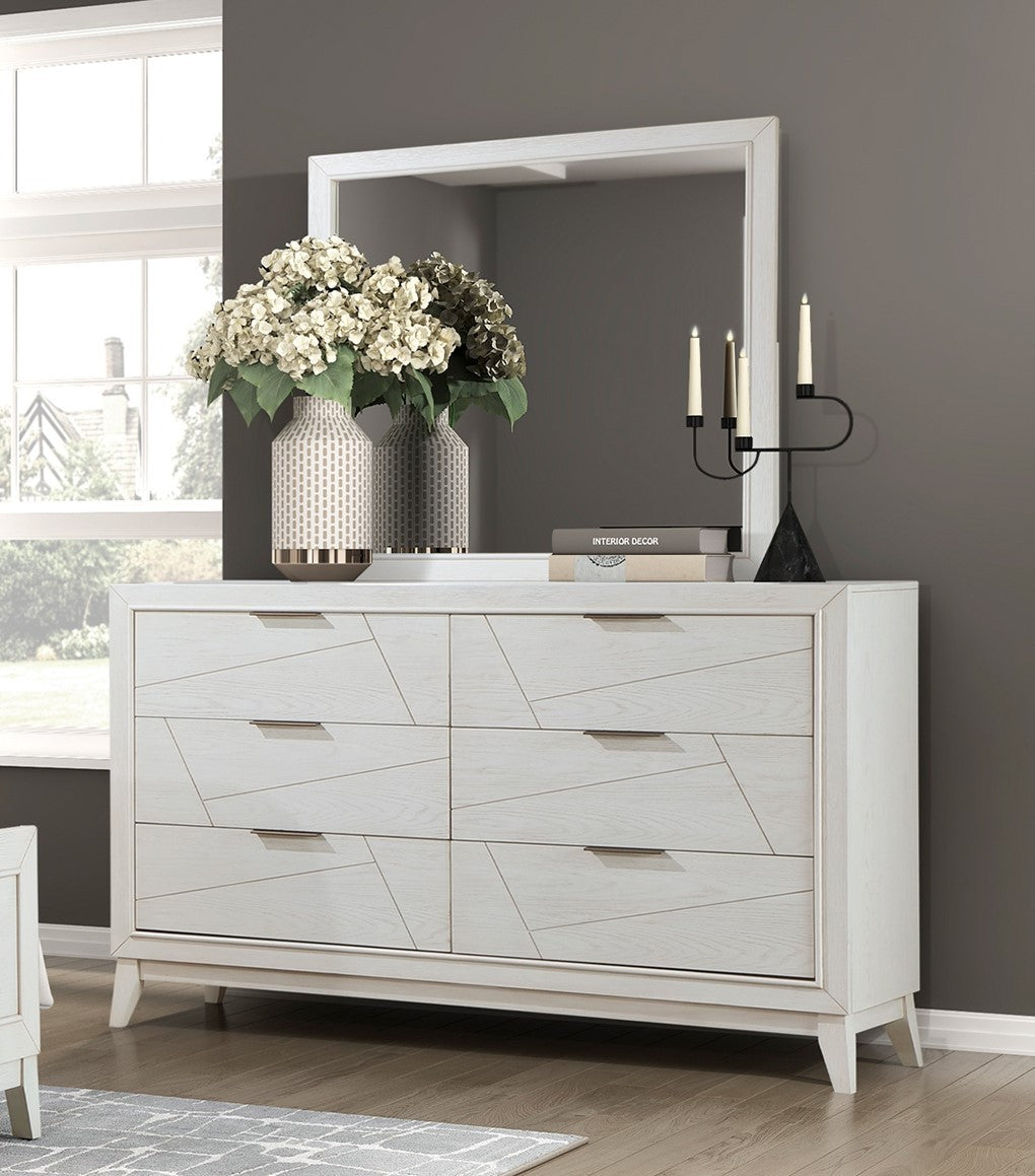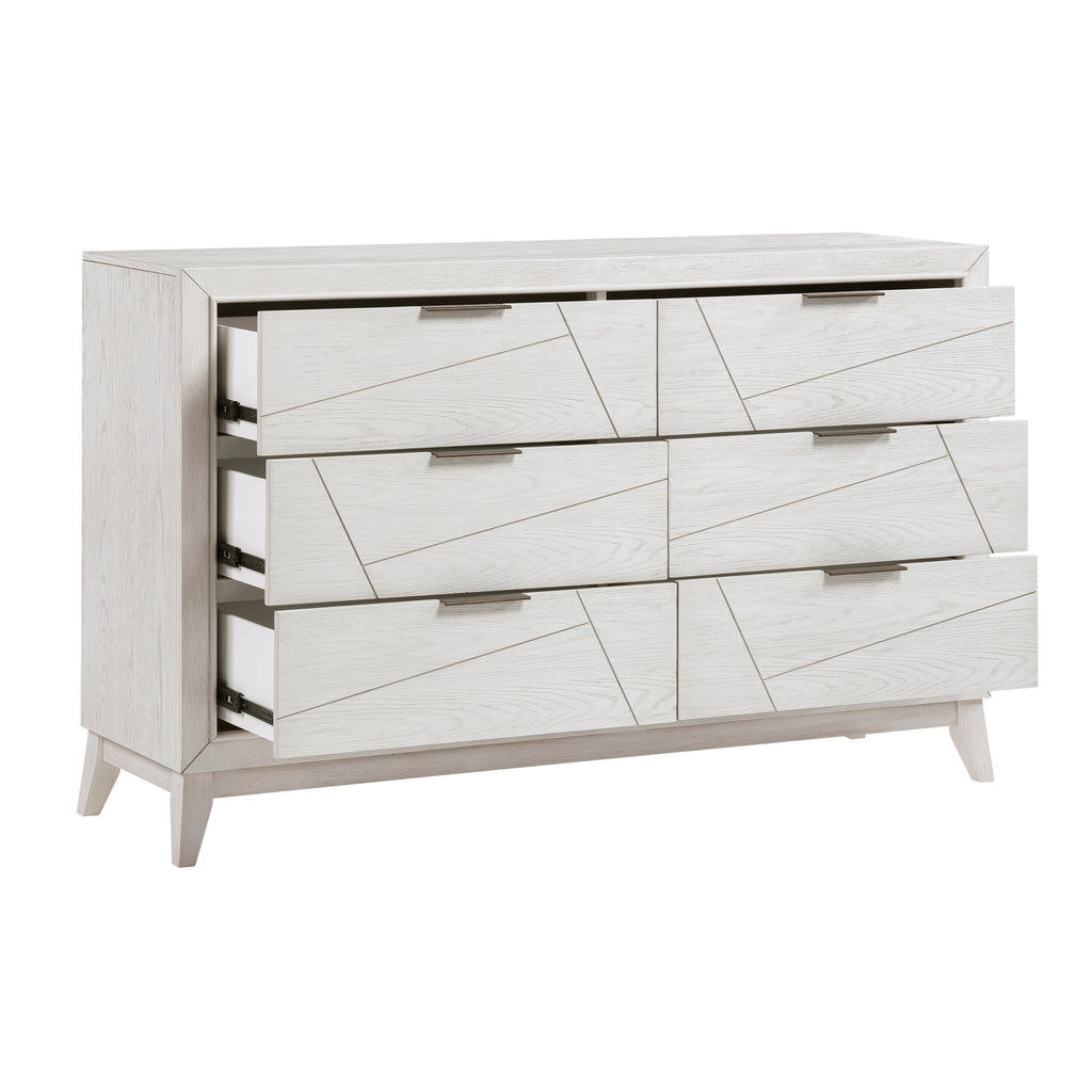 Bold geometrical styling is paired with unfettered modern lines to create the unique design of the Asteria Collection. An antique white finish highlights the collection’s oak veneer. Flat black finished metal bar hardware fronts the drawers of the dresser. Asymmetrical routing fronts the drawer faces for dramatic accent to the collection.