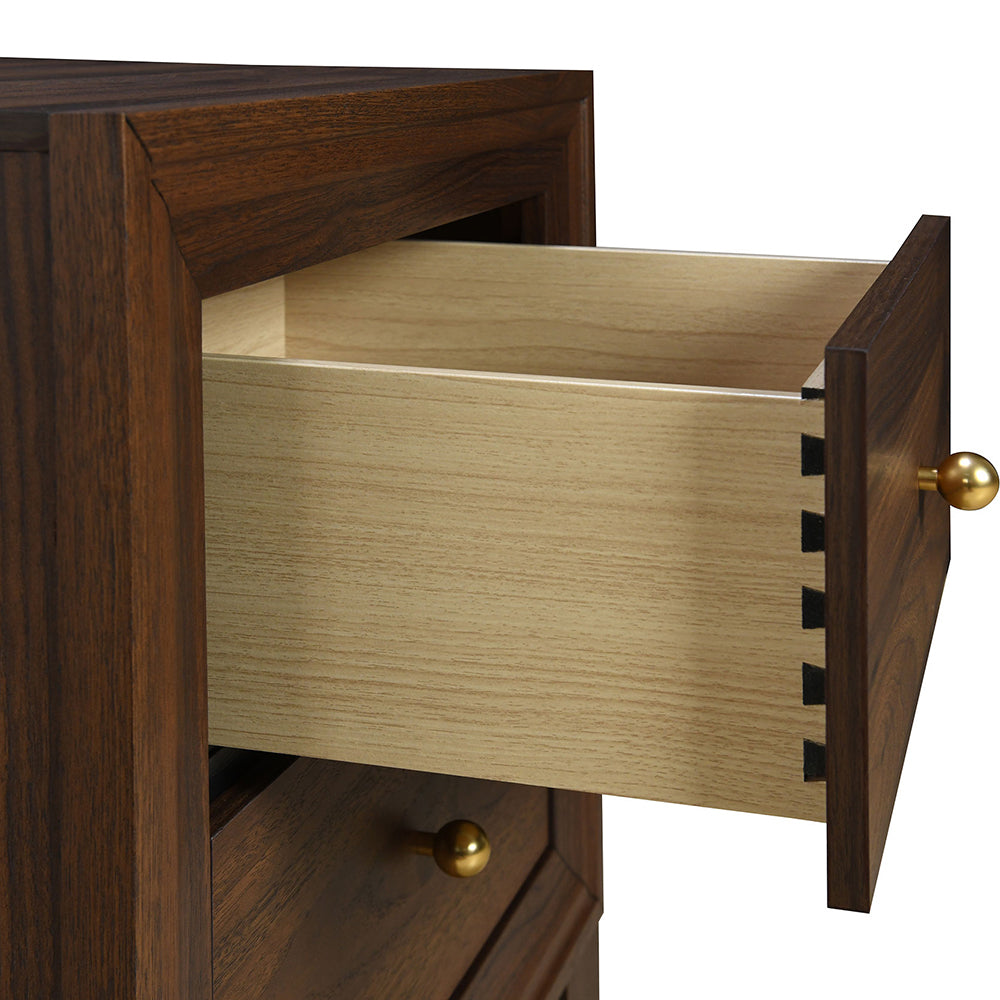 - Constructed from engineered wood with center metal extension glides and gold ball knobs, ensuring smooth drawer operation and lasting strength