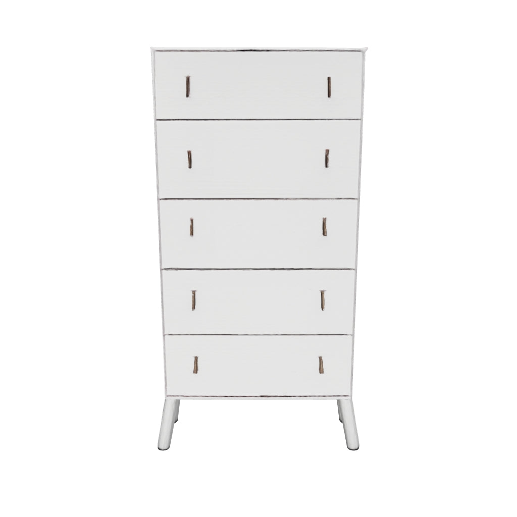 Dare to take minimalism to the max. This chest of drawers has an air of sleek simplicity thanks to its painted finish with subtle replicated wood grain. Magnificently mod splay legs are a compelling complement to the streamlined design. And with two sets of faux leather drawer pulls that allow you to customize the chest to suit your space, there's no doubt about it: This contemporary piece is sure to become a classic.