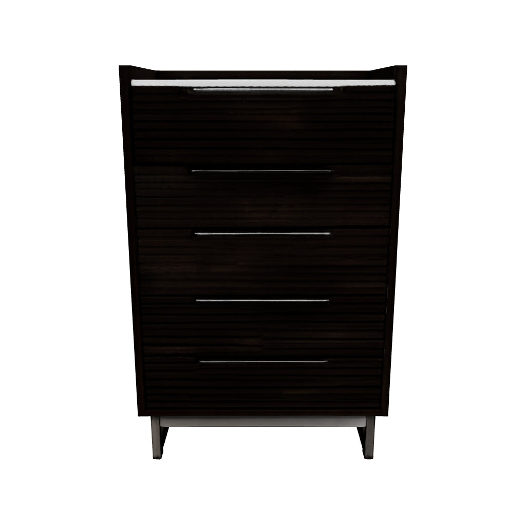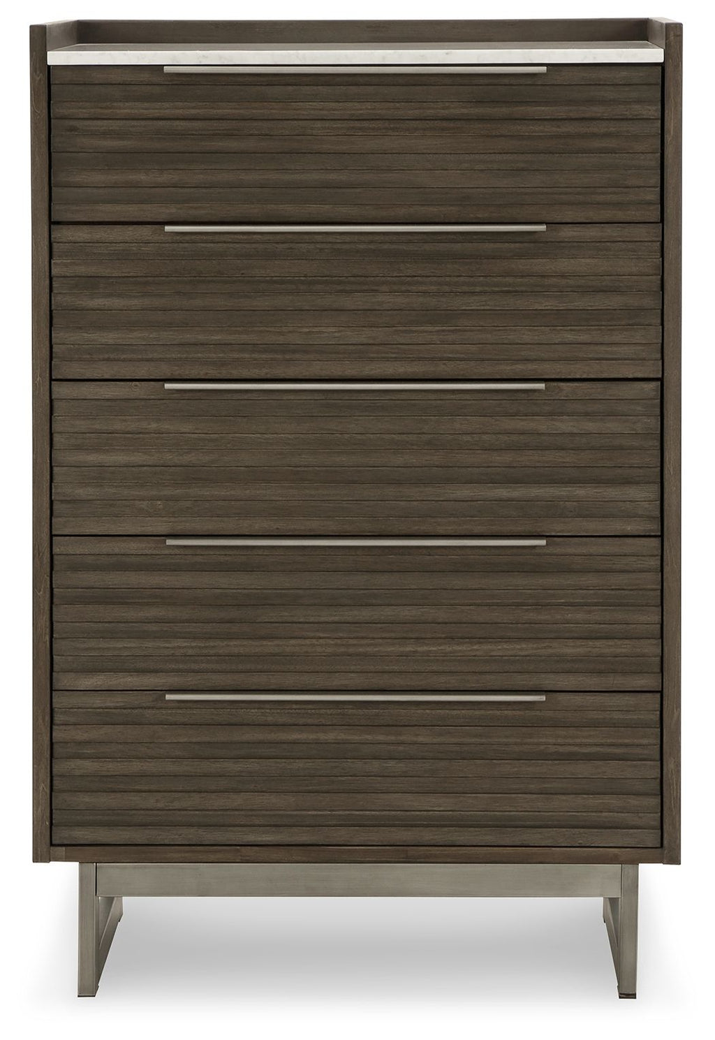 Clean lines lend sophistication and structure to this chest of drawers. Its complex rich grayish brown finish contrasts perfectly with a white marble top, while the streamlined silhouette features overlay slats to create visual interest. A metal base and bar pulls in a low-sheen steel finish add to this piece's contemporary vibe.