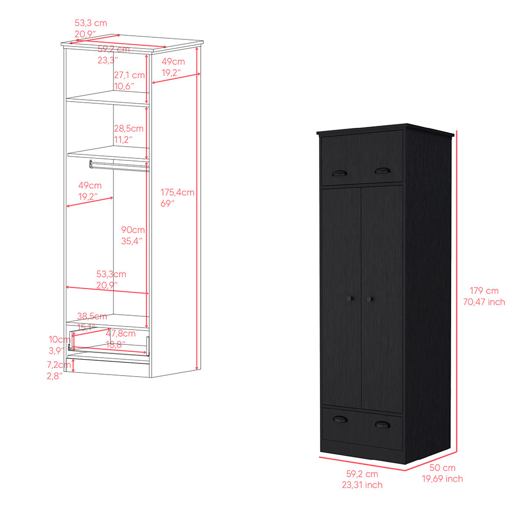 - The spacious double-door cabinet opens to reveal ample storage space with a sturdy hanging rod, providing an ideal solution for hanging clothes, jackets, and other garments neatly and wrinkle-free.