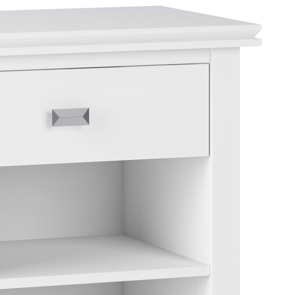 - Features one (1) spacious drawer with sturdy ball-bearing metal drawer glides for smooth drawer movement and an open bottom storage area with one shelf
