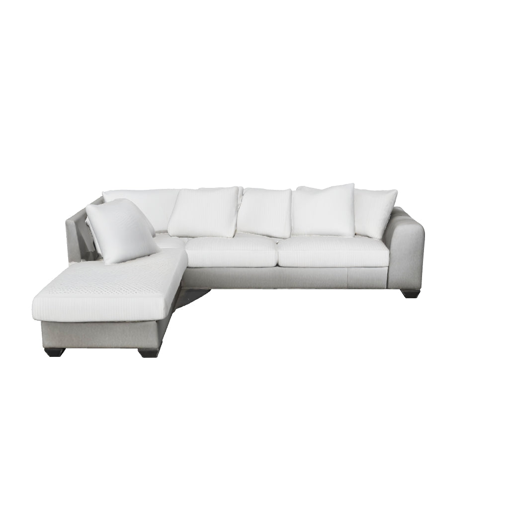 You want your living room to reflect your ultra-cool character. Introducing: this sectional with chaise. Its combination of retro-cool jumbo cord and sleek faux leather takes a unique approach to contemporary aesthetics. For a finishing touch, pillows provide a stylish scatter back silhouette.