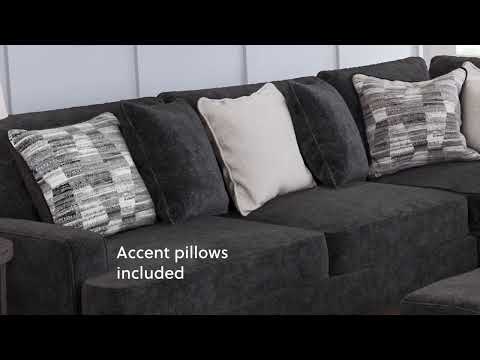 A match made in heaven, this sectional marries a cool, contemporary look and a decadently soft, plush microfiber feel. This irresistibly comfortable union is love at first touch at the end of a long day, or anytime you're ready to get serious about relaxing. Say I do to big-time comfort and style flanked by neatly finessed track arms in a clean, straightforward design. A medley of pillows in cream, black and gray blends effortlessly with any setting.