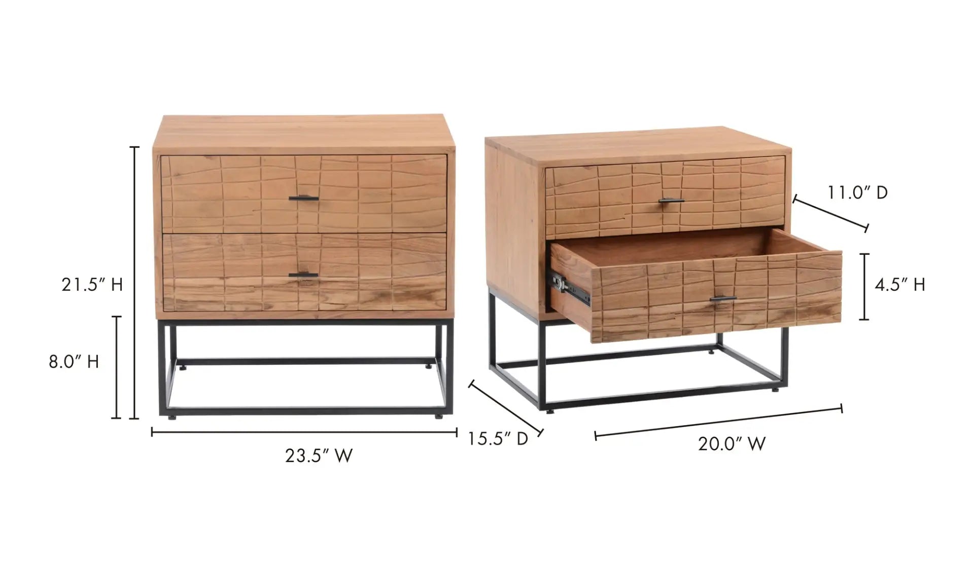 A slick natural look. The Atelier nightstand features two sliding drawers with a textured detailing. A cool iron frame supports this minimal stand. The ideal stylish spot for a complementary lamp, candle, or cup of tea. We offer 1 Year limited commercial warranty (covered for any manufacturer's defect).