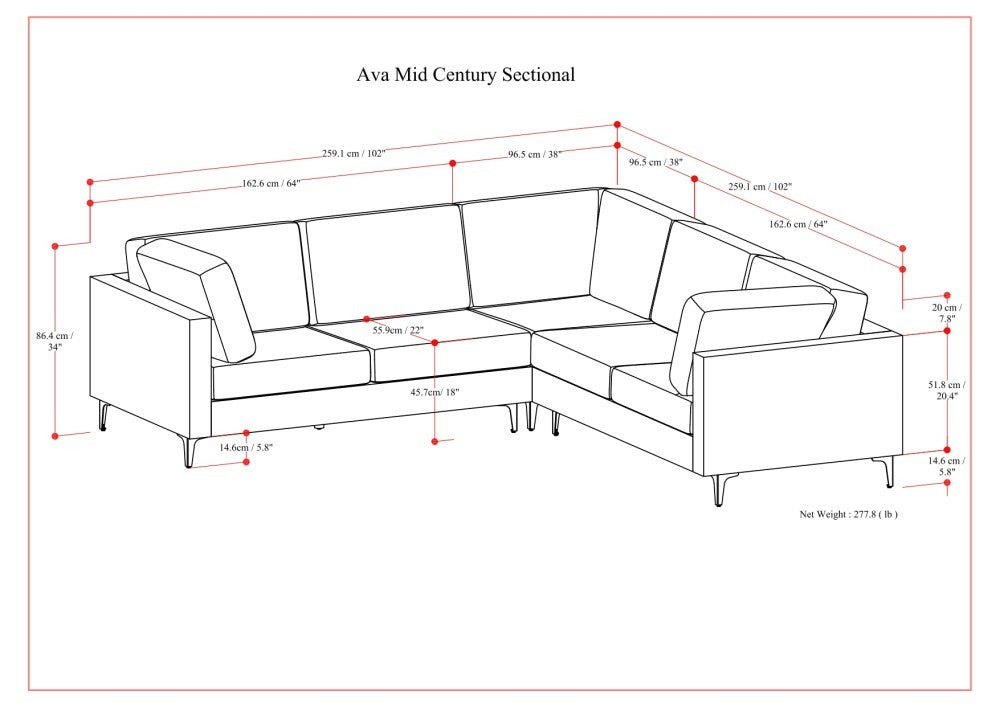 - Handcrafted, mid-century modern corner sectional sofa with tall, elegant metal legs is generously sized to offer comfortable seating for 5 people; it measures 102-inches wide and accommodates up to 1,200 lbs.