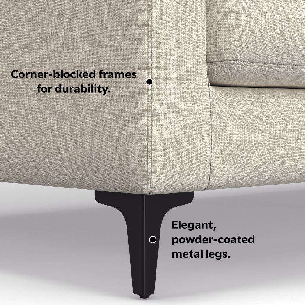 - Sturdy, corner-blocked frame made with solid and engineered woods includes high-quality, high-resilience webbing on the back for support; webbing and high-gauge sinuous springs under the seat to prevent sagging; and powder-coated metal legs in a black finish.