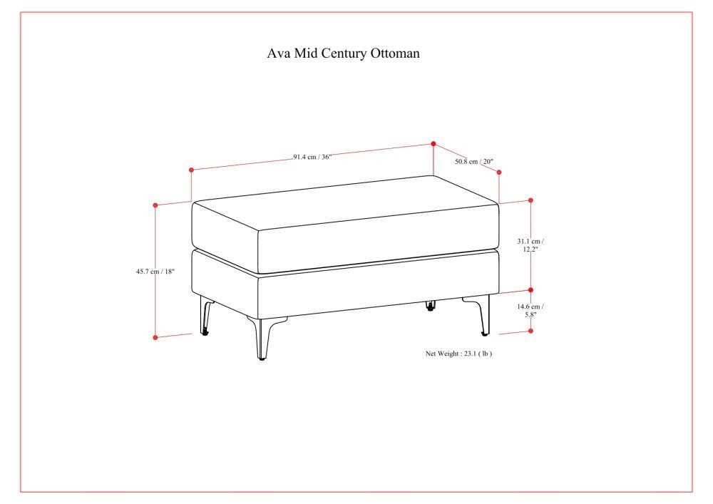 - Handcrafted, mid-century modern ottoman with tall, elegant metal legs can be used as a footrest and impromptu coffee table, or placed against one of the matching Ava sofas to turn the couch into a flexible sectional; accommodates up to 300 lbs.