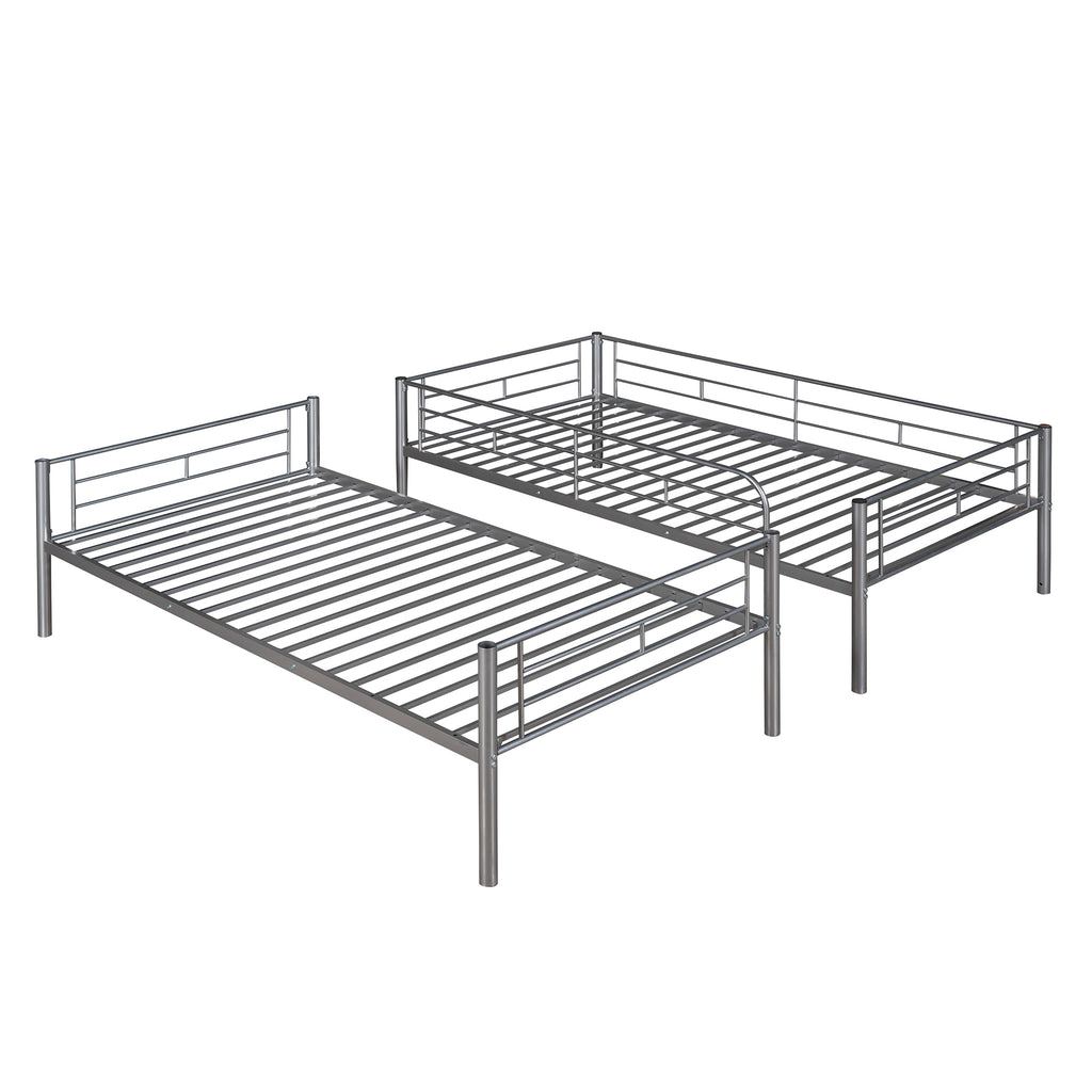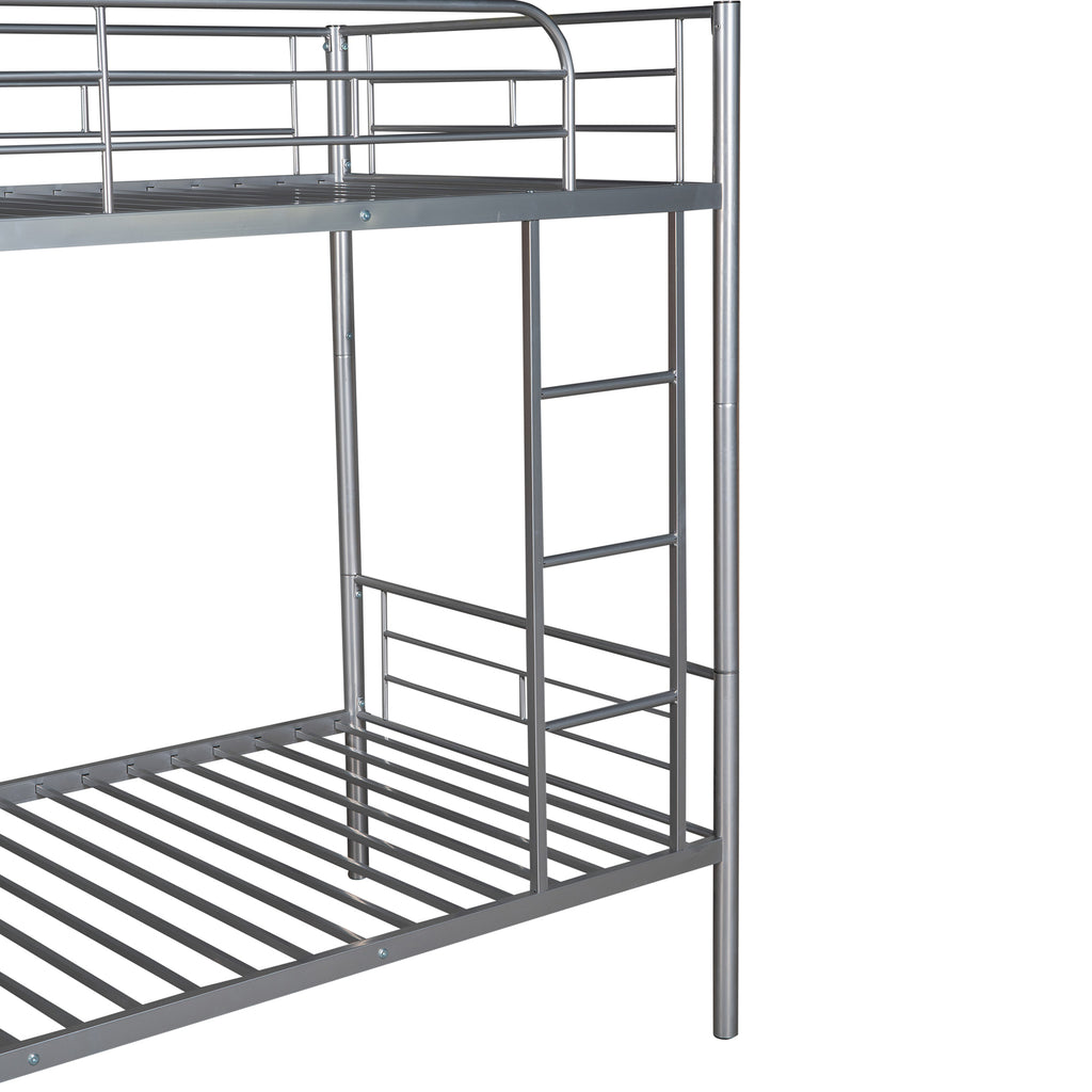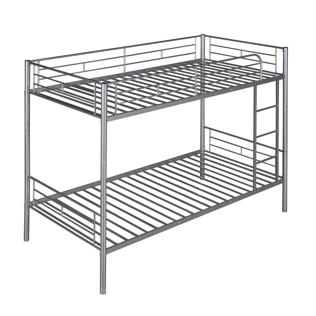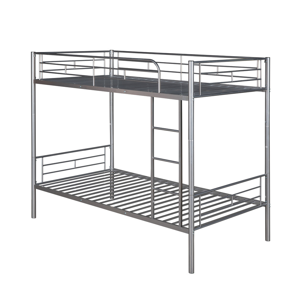 Maximize space with this sleek twin-over-twin metal bunk bed, featuring a durable steel frame and eye-catching silver finish. This versatile bed easily separates into two individual twin beds, adapting to your evolving needs while saving valuable floor space. Enjoy sound sleep with sturdy built-in slats and full-length guardrails, eliminating the need for a box spring.