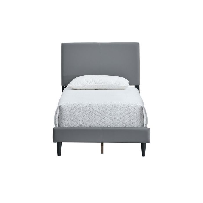 Elevate your bedroom with this modern light grey upholstered twin bed, featuring striking faux leather and a sleek design. Enjoy superior comfort and support with included slats, eliminating the need for a box spring. Its adjustable headboard and mattress compatibility make it a versatile, space-saving sleep solution for any room.