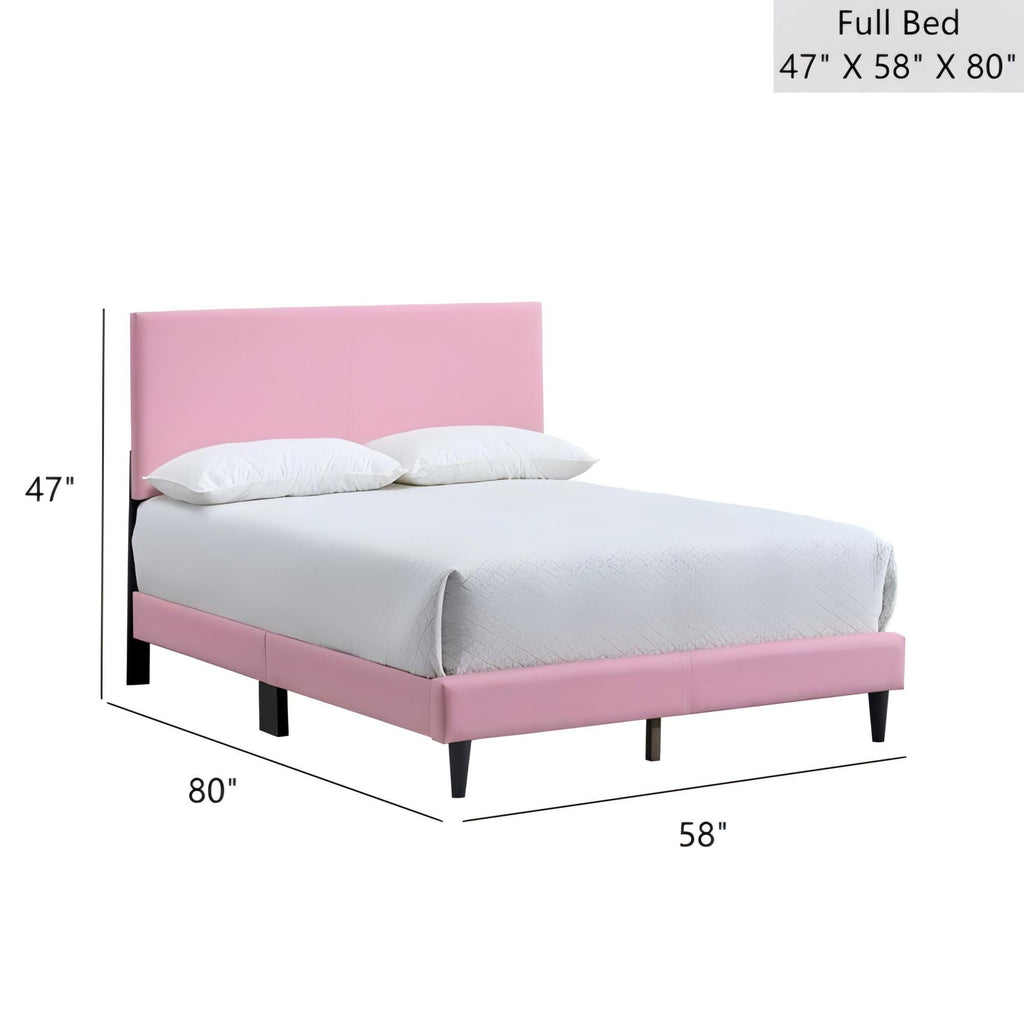 Elevate your bedroom with this striking pink upholstered full bed, featuring luxurious faux leather for a modern and comfortable sleep experience. Designed for convenience, it includes supportive slats, eliminating the need for a box spring foundation. Enjoy personalized comfort with an adjustable headboard, compatible with various mattress heights.