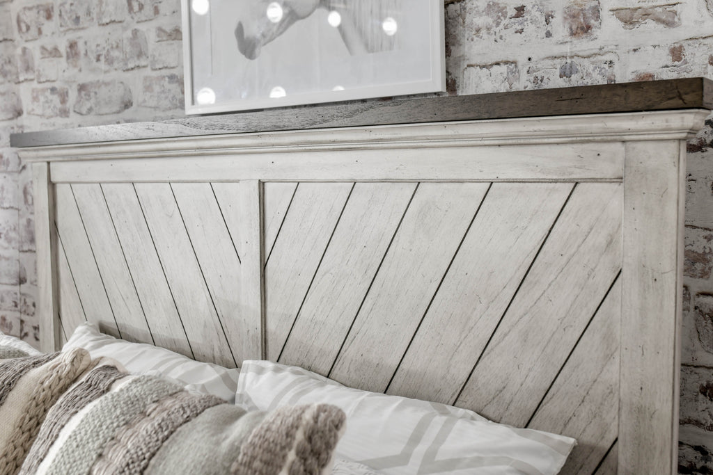 Elevate your space with this stunning Queen Faux Leather Bed, blending rustic farmhouse charm with elegant design. It features a distinctive chevron patterned headboard and footboard, beautifully accented by contrasting thick cap rails. The white-smoke finish with honey-smoke tops creates a captivating centerpiece for your bedroom.