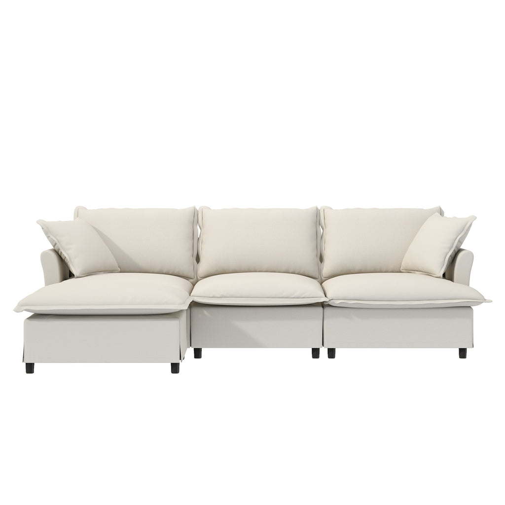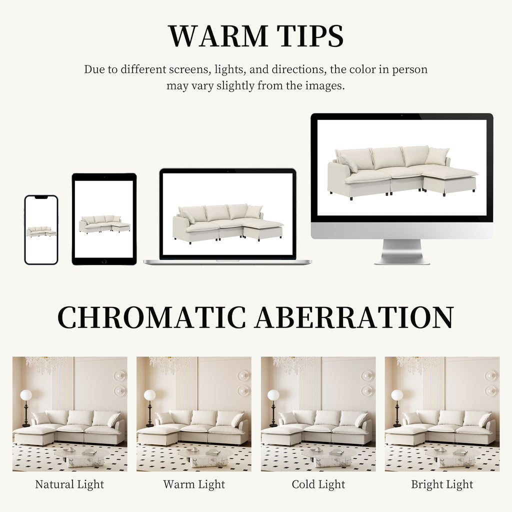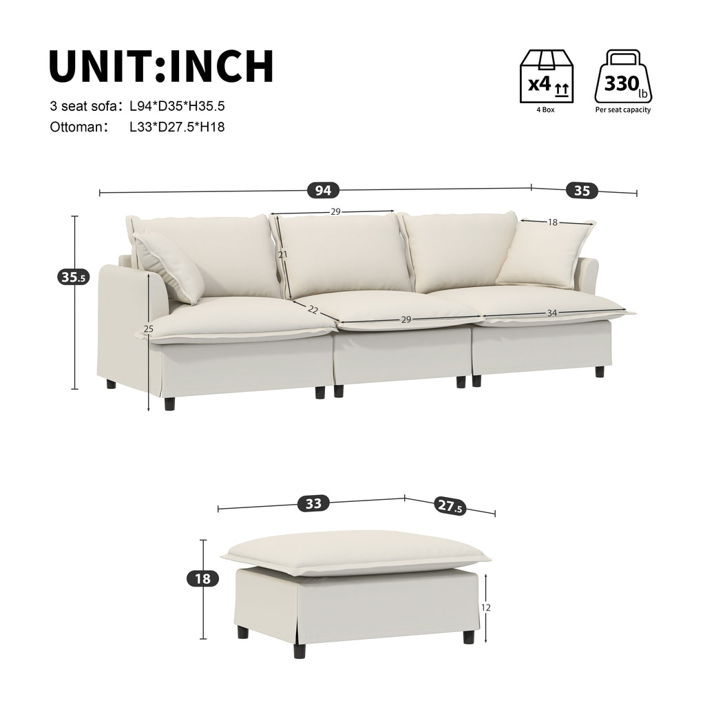 - Modular Design: The sofa features a versatile modular design, consisting of three key pieces: 1 three-seater and ottoman. These modules can be freely combined to create various seating arrangements, allowing you to customize the layout to suit your specific space. Additionally, individual modules can be purchased separately, giving you the flexibility to expand or adjust the configuration as needed.