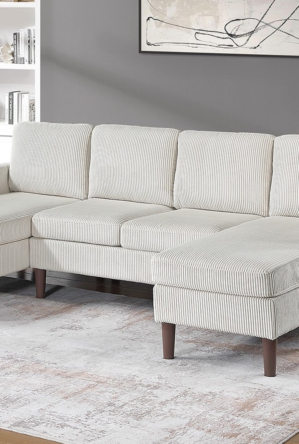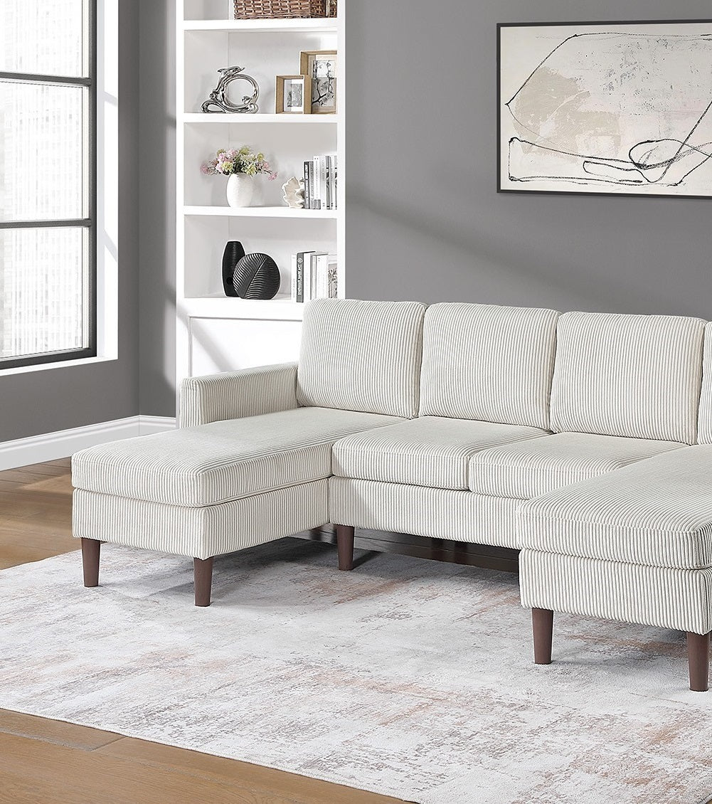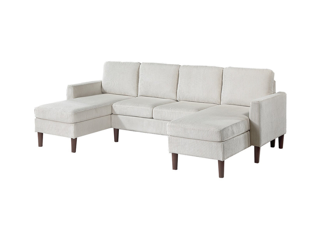 Enhance your home with the perfect combination of modern elegance and cozy relaxation. The dual chaises on either side create the ultimate relaxation zones, allowing multiple people to lounge at once without feeling crowded. Whether you're stretching out with a good book, enjoying a movie night, or entertaining guests, this sectional adapts effortlessly to your lifestyle. The armless two-seater section in the middle keeps the layout open and seamless, making the sectional feel even more spacious. Wrapped in soft and textured corduroy fabric, the sectional provides a plush, inviting feel that enhances both comfort and style. The deep ridges of the corduroy upholstery not only add a sophisticated touch but also create a warm and cozy atmosphere. The durable material ensures longevity, making it an excellent choice for everyday use. With its modern silhouette, the sectional features sleek square arms that give it a structured and contemporary look. With its luxurious corduroy upholstery, modern square arms, elegant tapered legs, and dual chaise seating, this sectional delivers the perfect combination of contemporary design and inviting comfort.