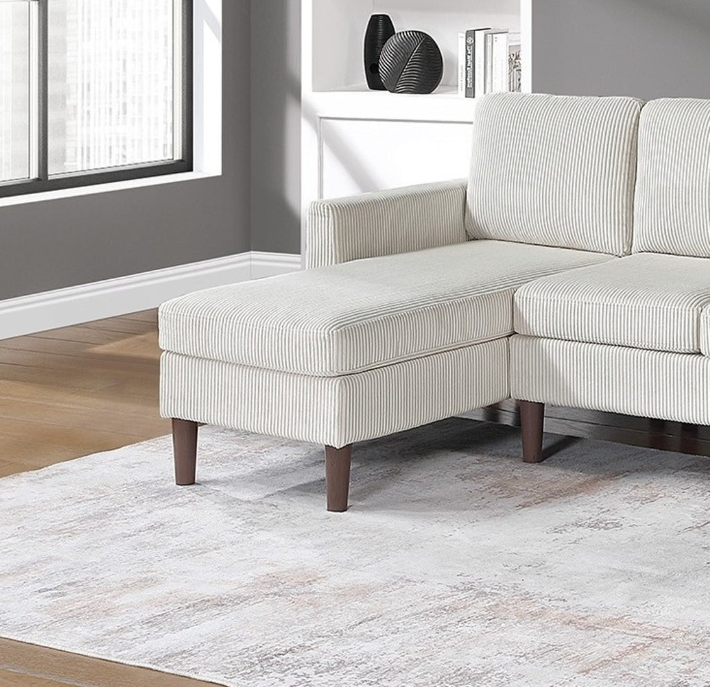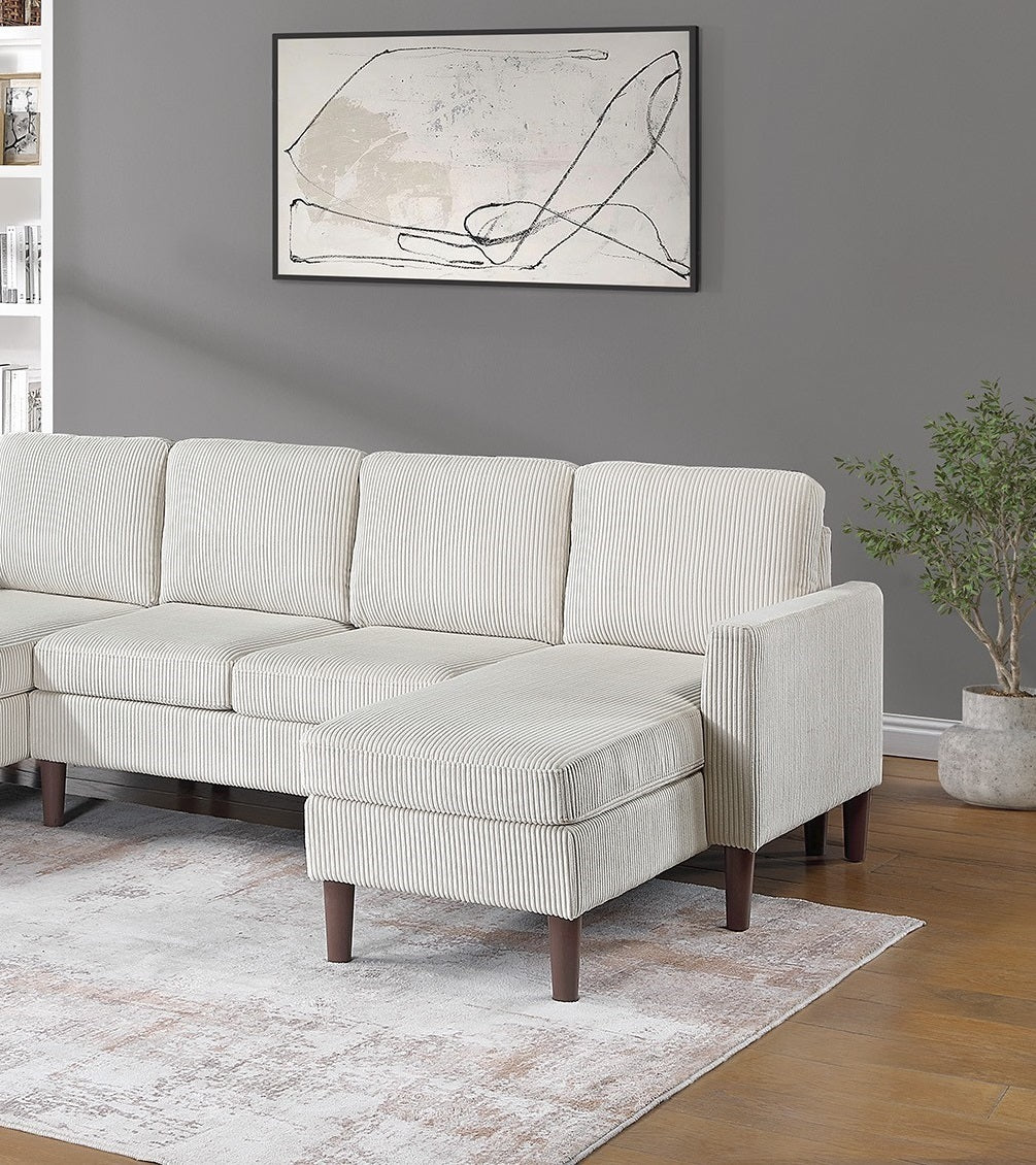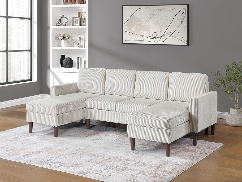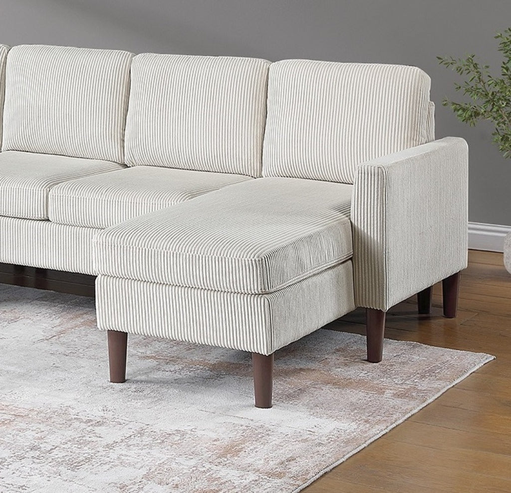 Enhance your home with the perfect combination of modern elegance and cozy relaxation. The dual chaises on either side create the ultimate relaxation zones, allowing multiple people to lounge at once without feeling crowded. Whether you're stretching out with a good book, enjoying a movie night, or entertaining guests, this sectional adapts effortlessly to your lifestyle. The armless two-seater section in the middle keeps the layout open and seamless, making the sectional feel even more spacious. Wrapped in soft and textured corduroy fabric, the sectional provides a plush, inviting feel that enhances both comfort and style. The deep ridges of the corduroy upholstery not only add a sophisticated touch but also create a warm and cozy atmosphere. The durable material ensures longevity, making it an excellent choice for everyday use. With its modern silhouette, the sectional features sleek square arms that give it a structured and contemporary look. With its luxurious corduroy upholstery, modern square arms, elegant tapered legs, and dual chaise seating, this sectional delivers the perfect combination of contemporary design and inviting comfort.