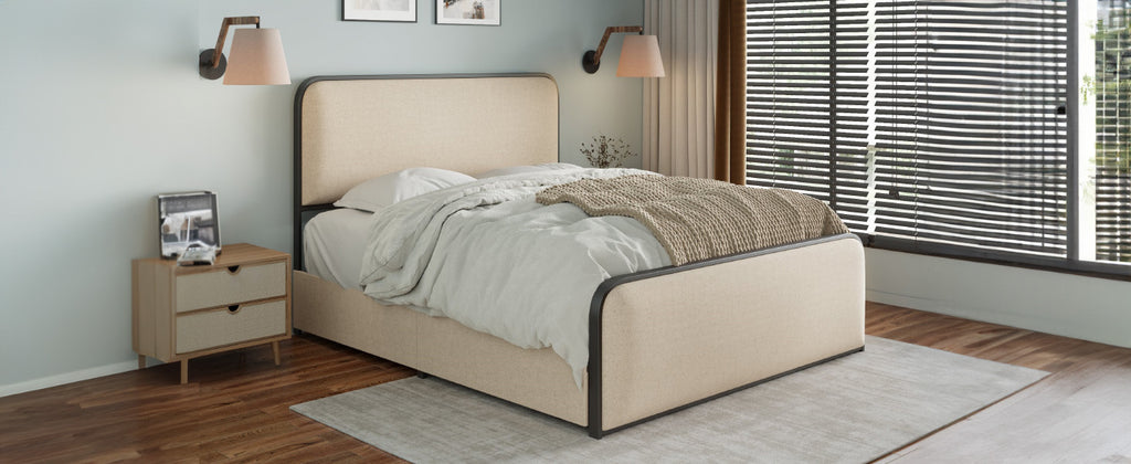 Elevate your bedroom with this modern King size metal bed frame in stylish beige, featuring a soft upholstered headboard for ultimate comfort and support. Maximize your space with four integrated under-bed storage drawers, while the robust 800 lbs capacity all-metal structure ensures lasting durability and silent nights. Enjoy peace of mind with a safe, rounded-edge design and hassle-free assembly, making this bed a perfect blend of elegance and functionality.