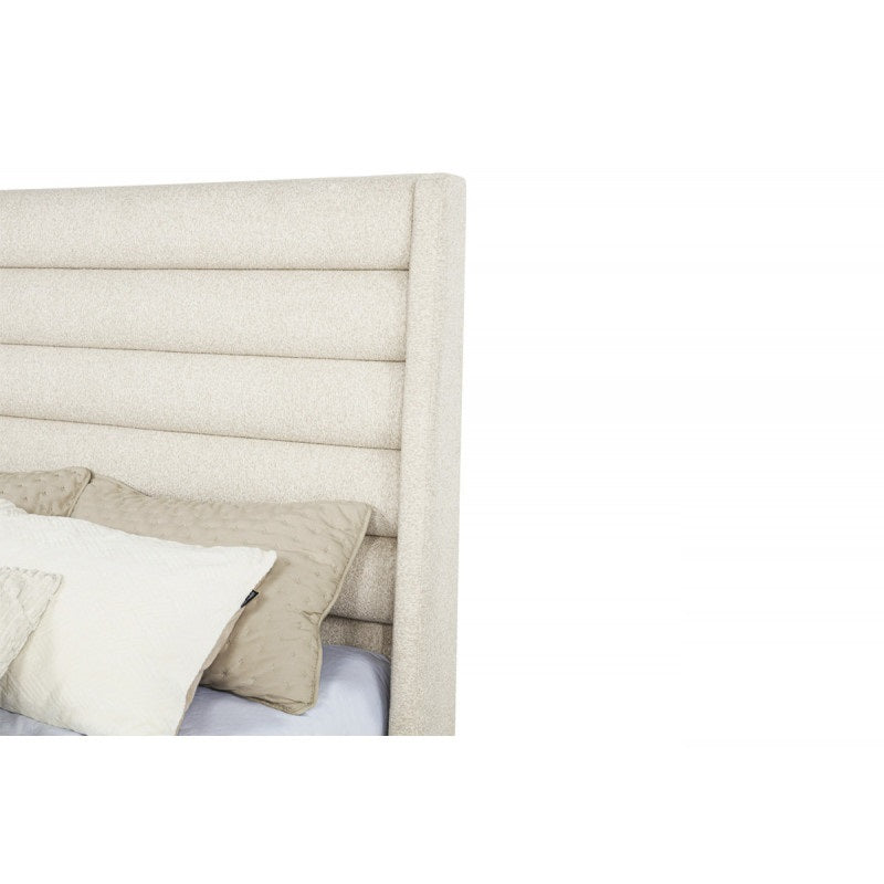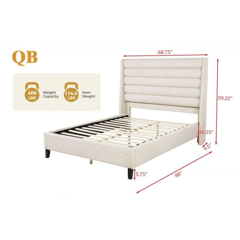 Elevate your bedroom with this contemporary Queen platform bed, featuring chic beige polyester upholstery and elegant channel tufting on its high headboard. Crafted from durable manufactured wood, this low-profile design eliminates the need for a box spring with its complete slat unit for ultimate convenience. Experience modern style and effortless comfort with this easy-to-assemble upholstered bed frame, perfect for any stylish slumber space.